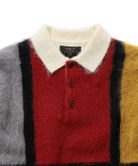A colorful BEAMS PLUS knit polo shirt featuring six different colors on the front.