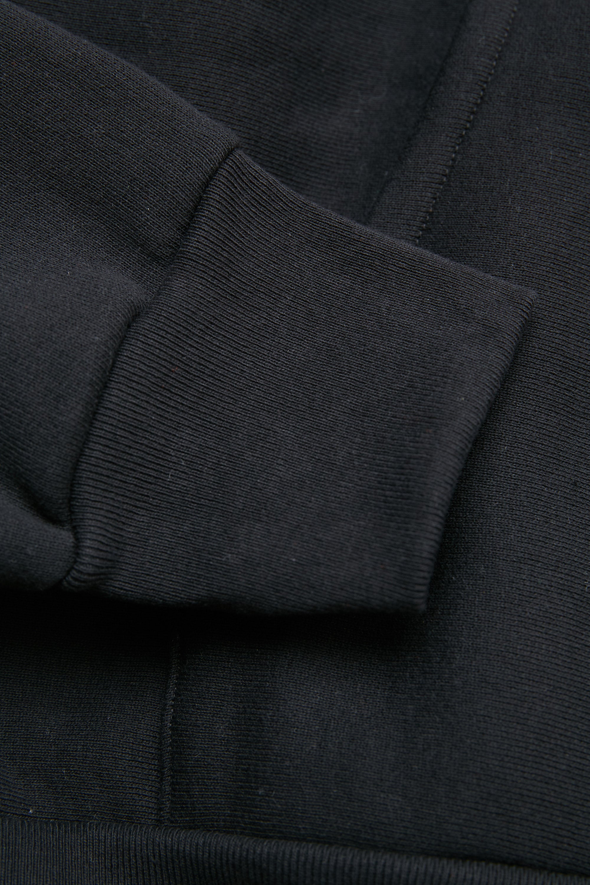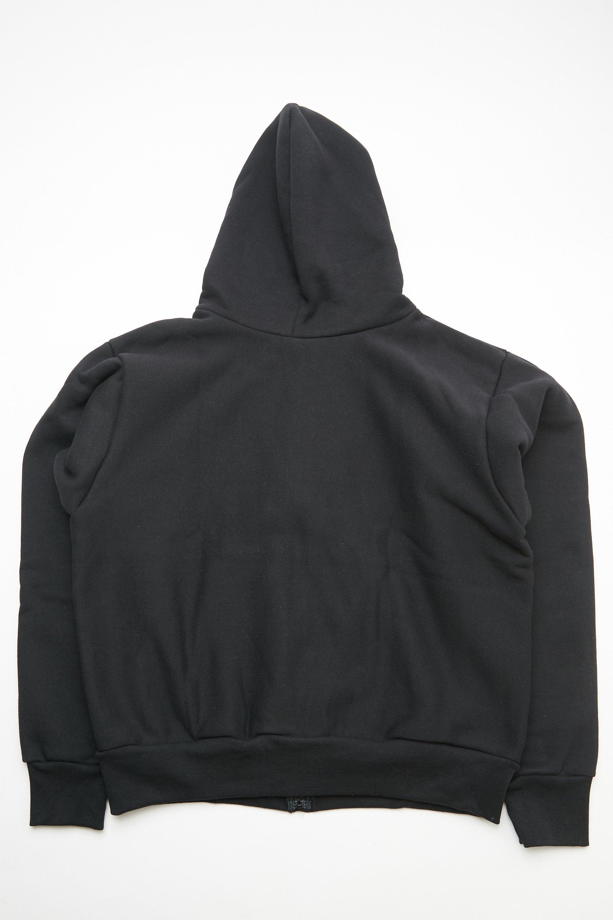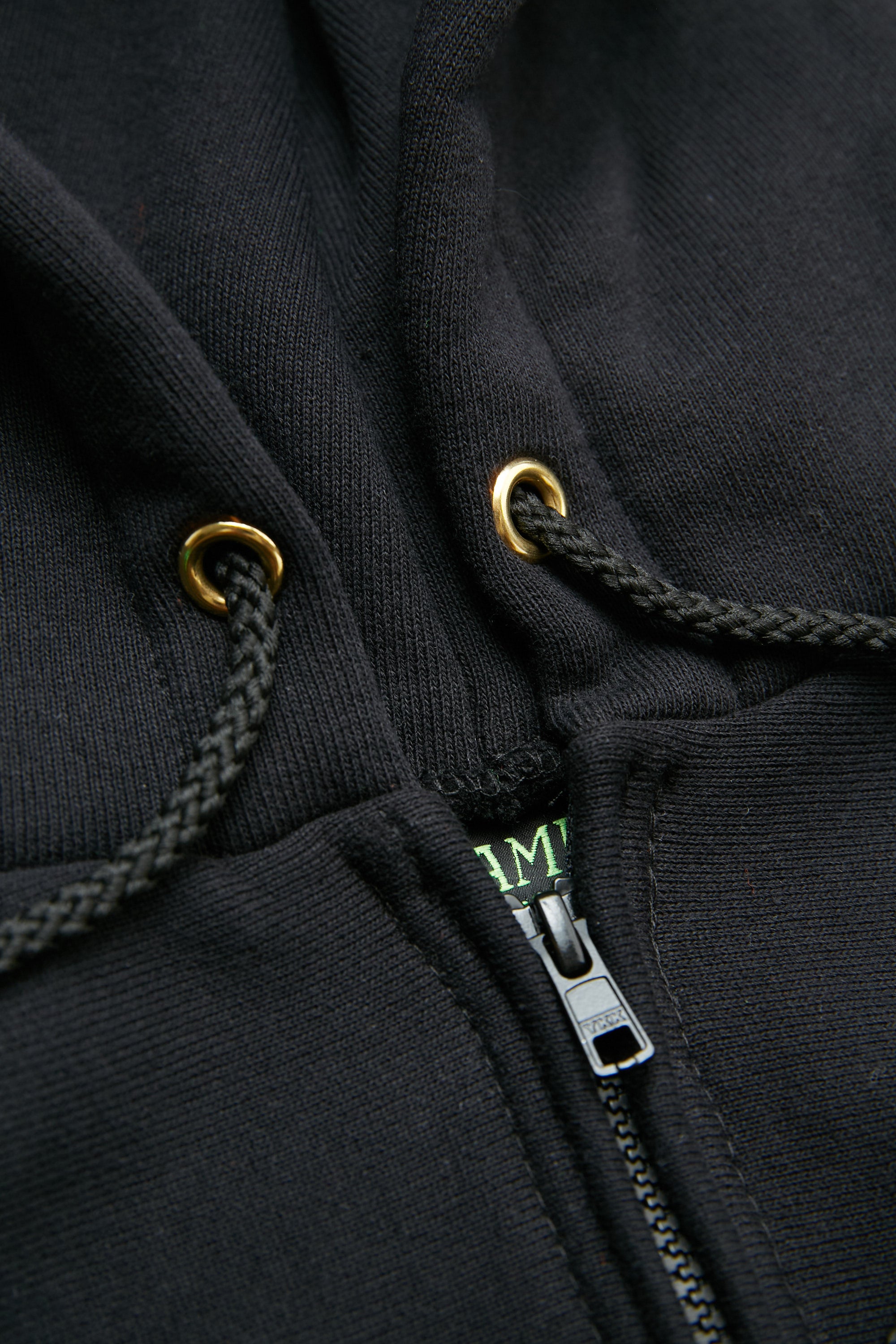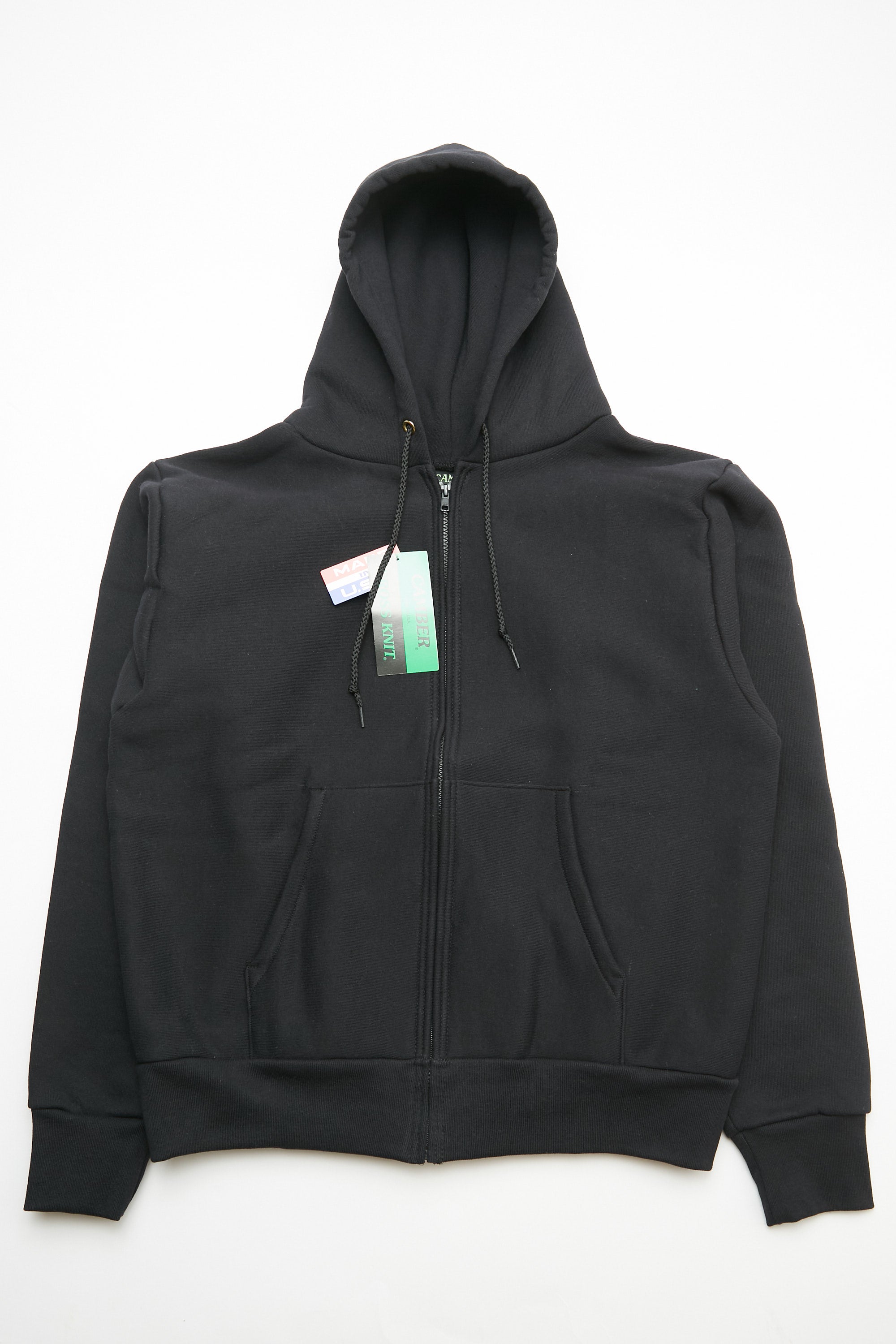 Heavyweight hooded sweatshirt. Drawstring hood with brass eyelets. Plastic zipper. Set-in sleeves. Muff pockets.