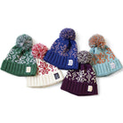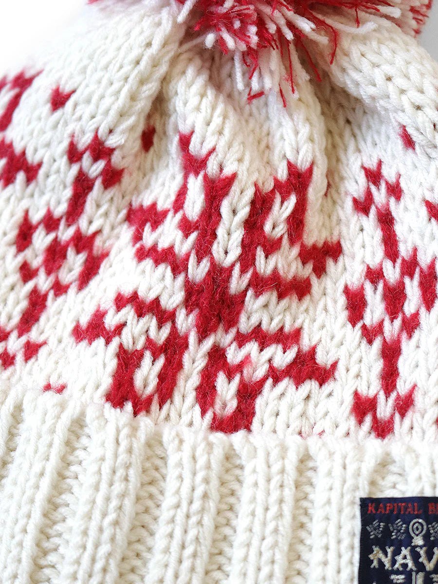 This seasonal knit cap features an elegant snow pattern and a charming pompom at the crown. Crafted from a softly woven, loosely knitted fabric, it offers a relaxed fit with refined texture. Please note, the delicate knit requires careful handling to avoid snagging and fraying.