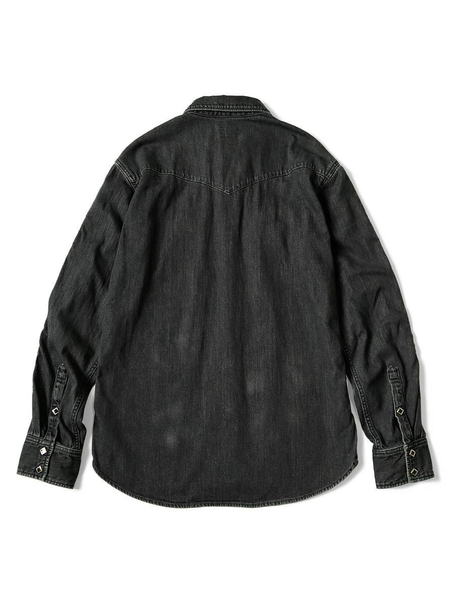 A western shirt made from light-ounce black denim that has undergone second-hand processing. It has a simple straight silhouette and is accented with vintage-like studs and diamond-shaped dot buttons on both sleeves.