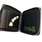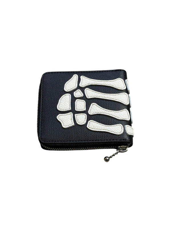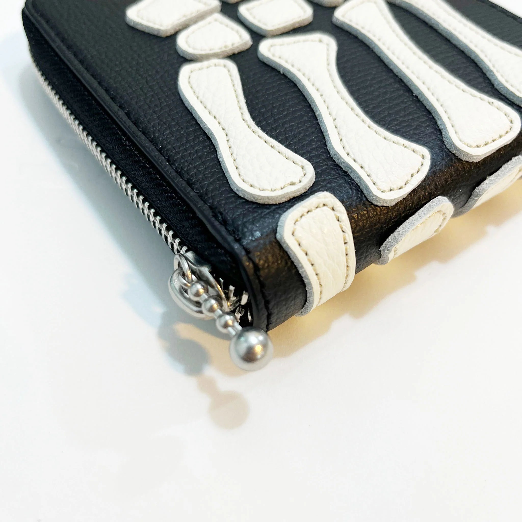 Add a touch of quirky style to your everyday life with the Kapital Thumb-Up Bone Band Zip Wallet. Made with genuine leather, this wallet features a unique skeleton hand design that is sure to turn heads. Stay organized and make a statement with this playful and functional accessory.