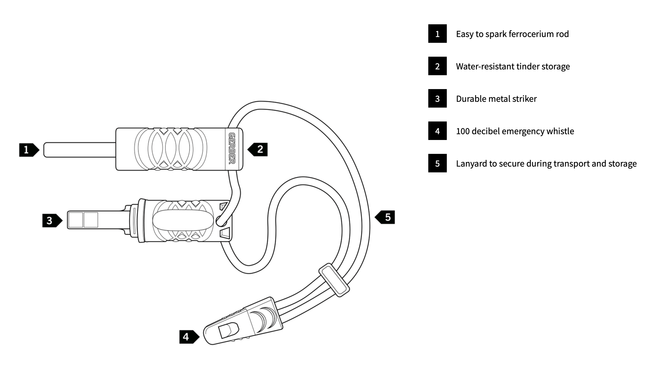 Gerber’s Fire Starter is a compact, packable survival tool that is easily attached to a backpack or keychain with a lanyard, ensuring you are always prepared.