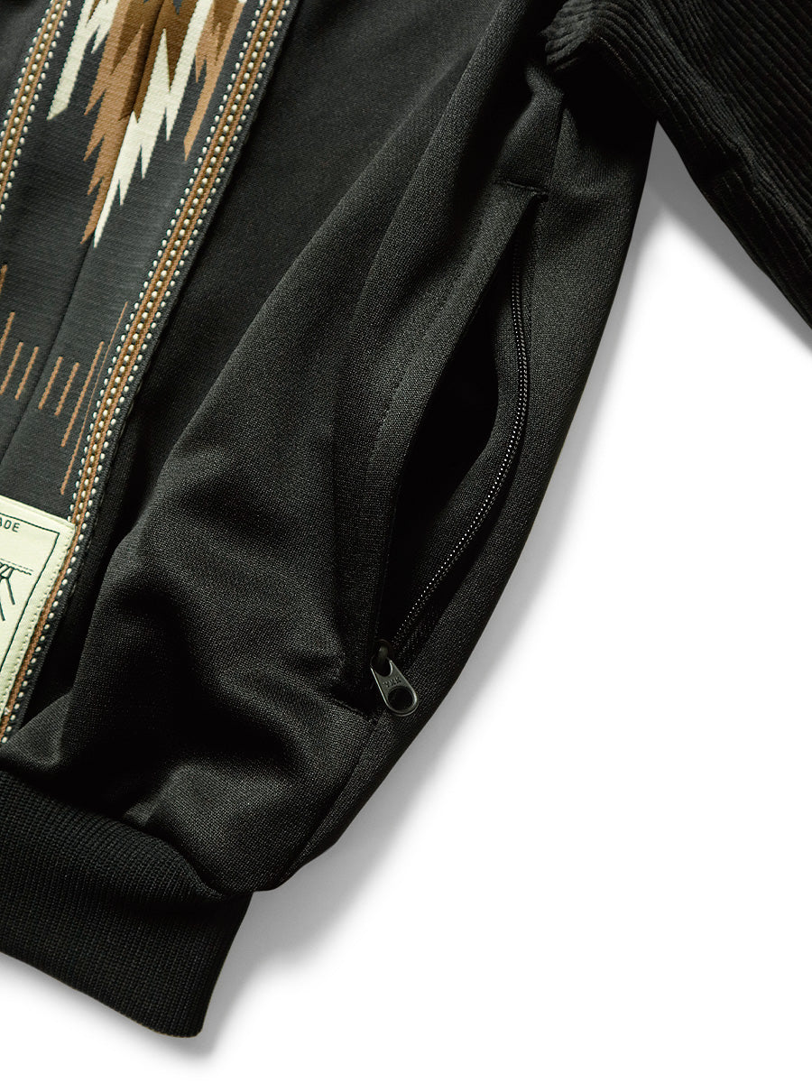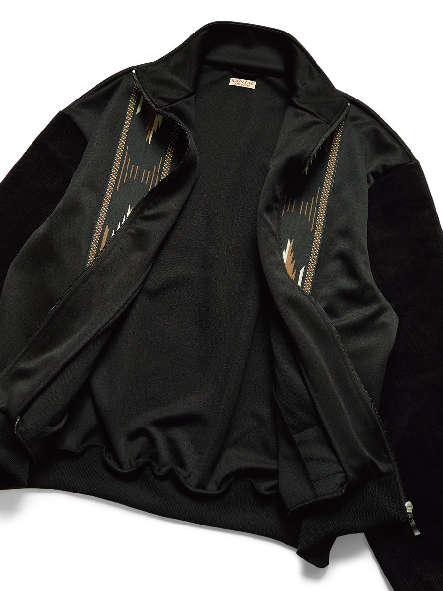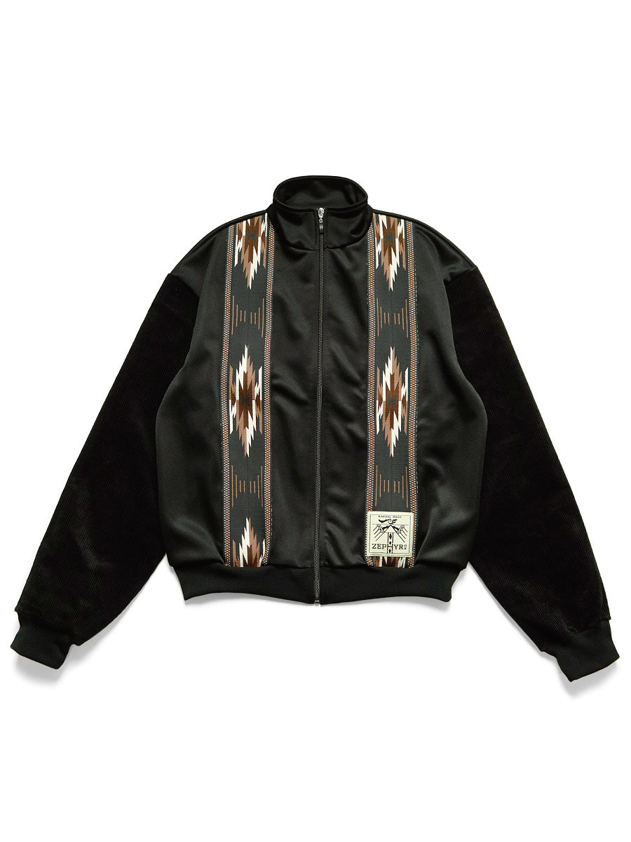 An eye-catching track jacket with an Ortega patterned front line. It uses smooth jersey with a smooth touch, and the sleeves are switched with a medium-ridge corduroy fabric.