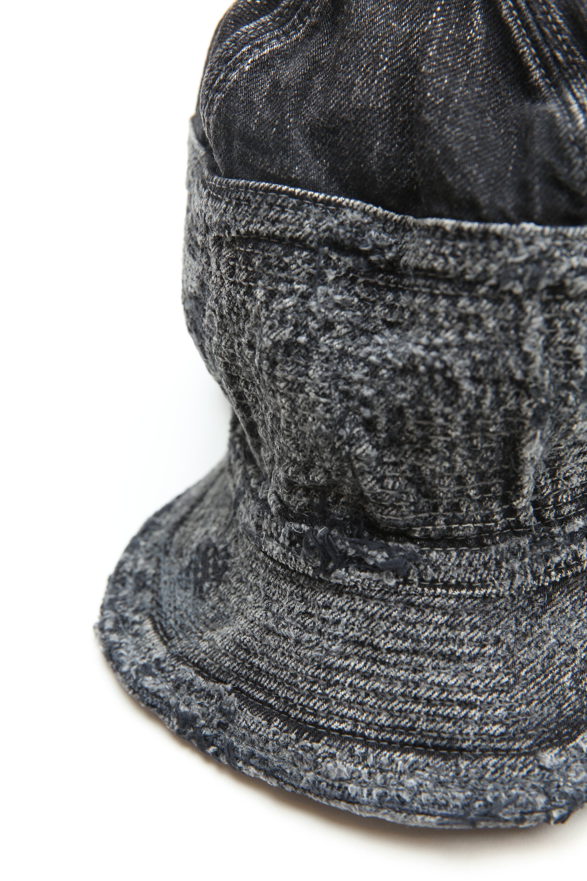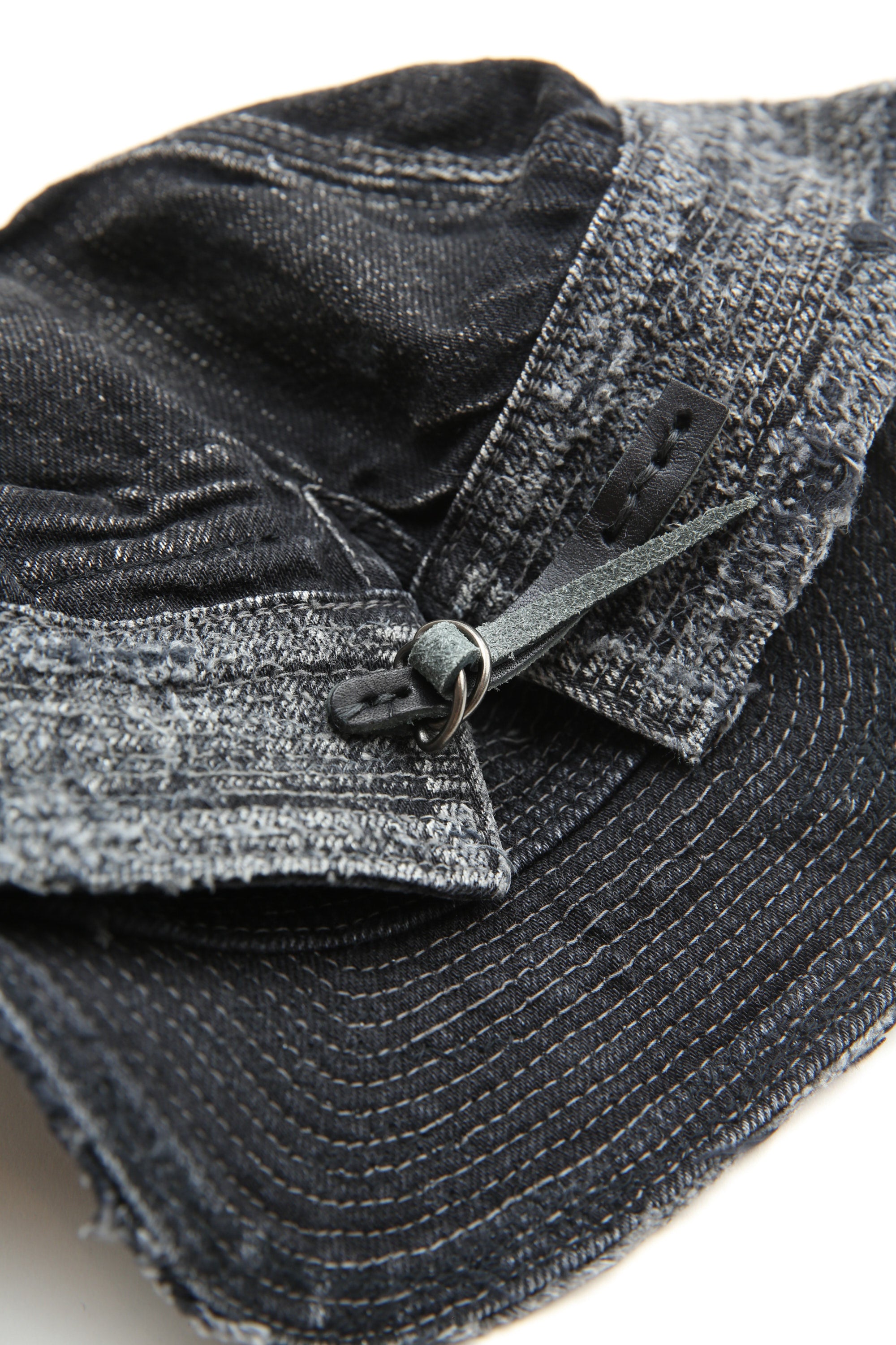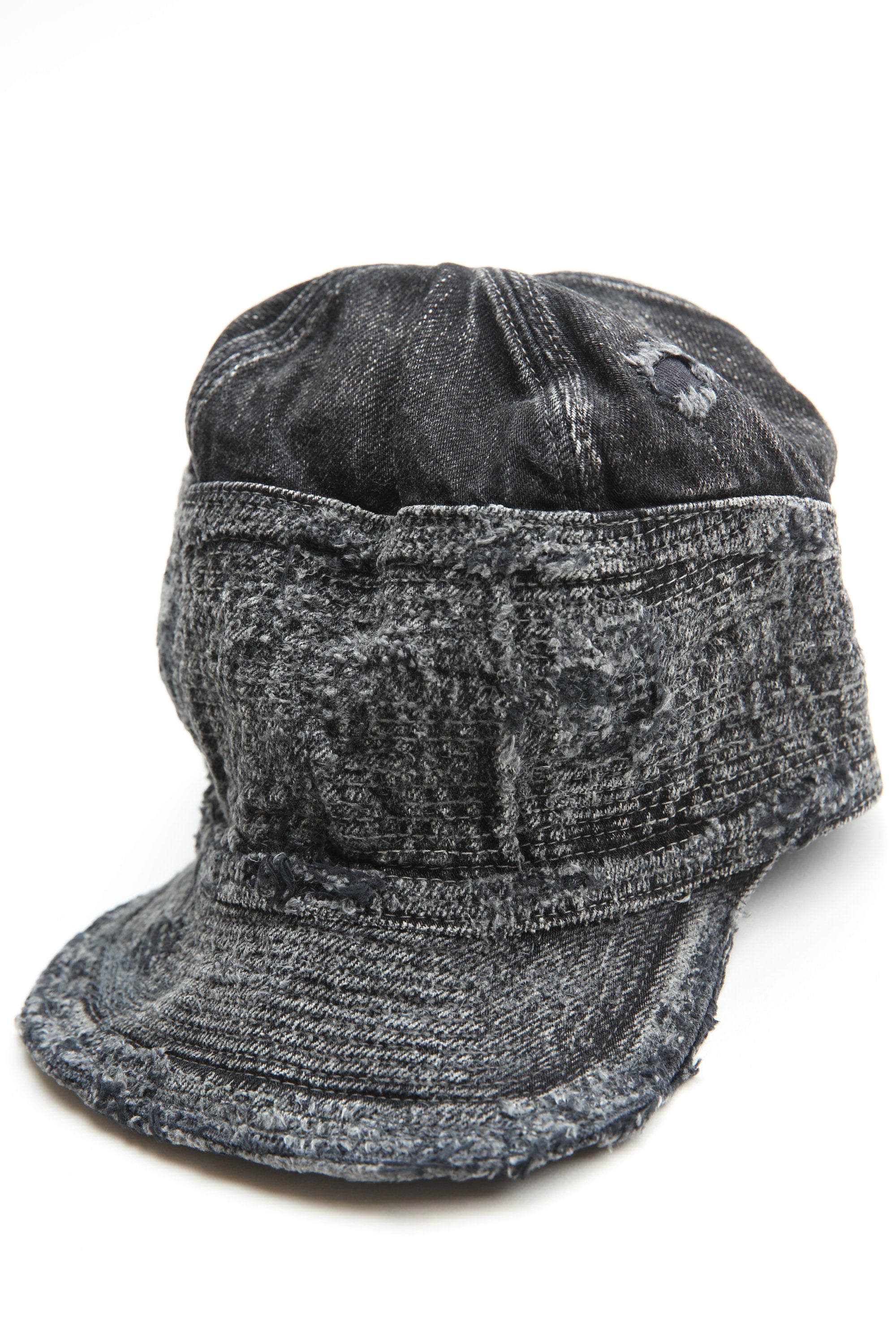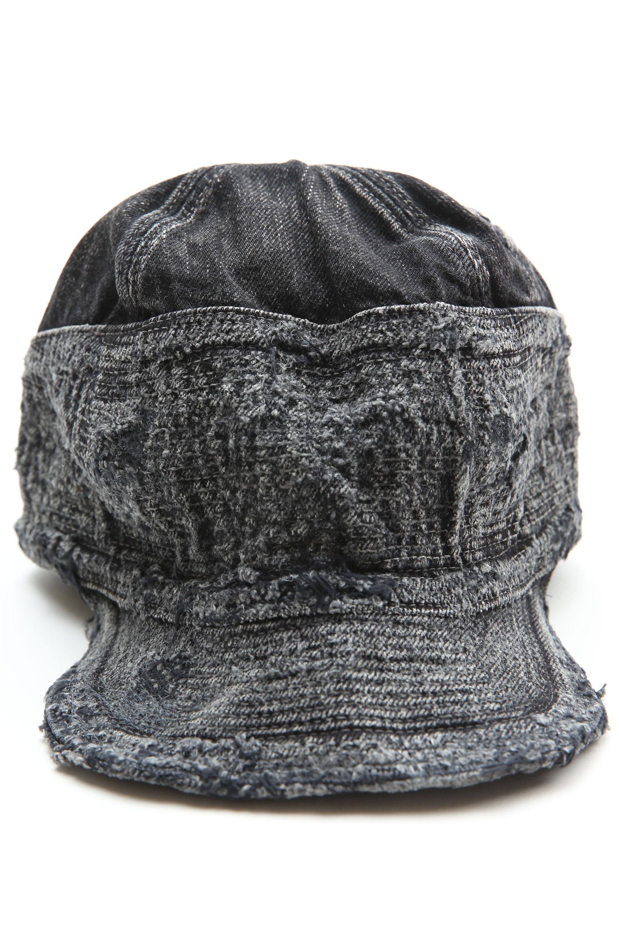 CAP is both a reinforcement and a decoration with countless stitches that fill all sides from edge to end of the crown and more than half of the crown. Black x black denim woven using black dyed yarn on warp and weft. The characteristic shape is a unique design that is unlikely to combine a work CAP and a baseball CAP.