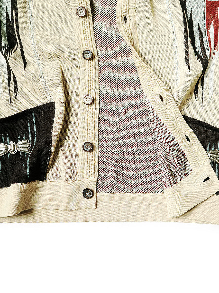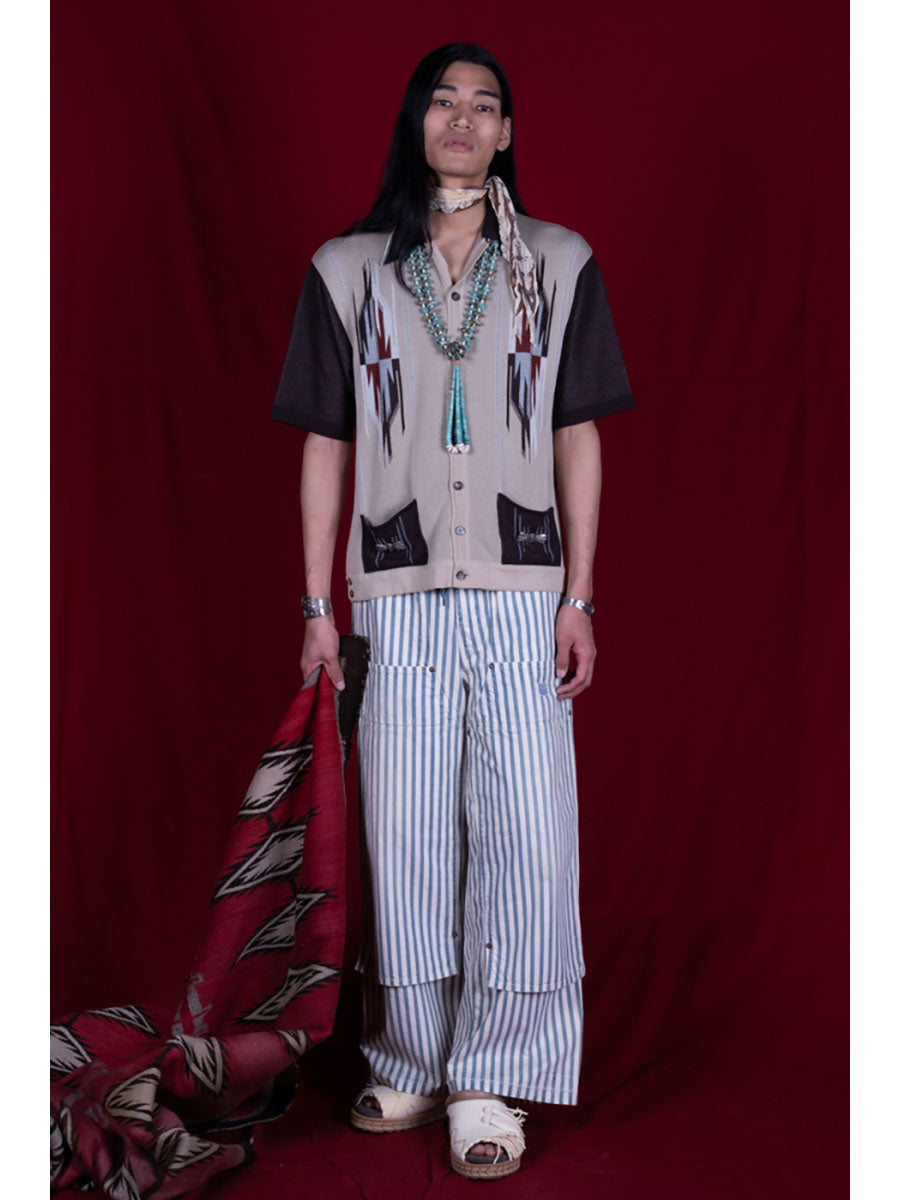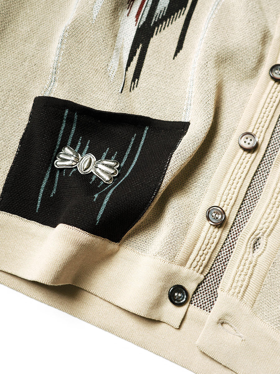 This polo shirt is made of a cotton knit material that incorporates an aloha shirt design with an open collar and front buttons. Chimayo pattern design is a traditional Native American pattern. A butterfly-shaped concho is attached to the pocket. The side slits are decorated with buttons.