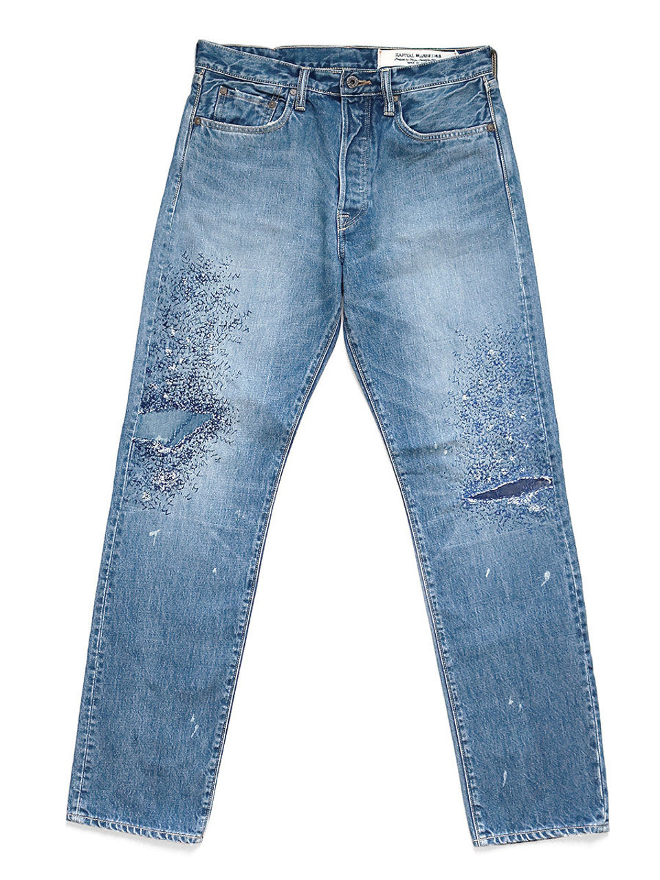 Made by skilled KOUNTRY craftsmen, this denim is inspired by well-worn pants that have endured three years of hard use. Sporting sashiko stitching, damage, and a faded look, each piece is uniquely remade. Be aware that due to the use of IDG dyes, some color transfer may occur when worn. Keep in mind that this product is purposely aged and features tears and damage intended as part of the design, not as defects. Plus, since it mimics the effects of aging, you may notice some weakening of the fabric. Made from 100% cotton with a touch of cowhide leather.