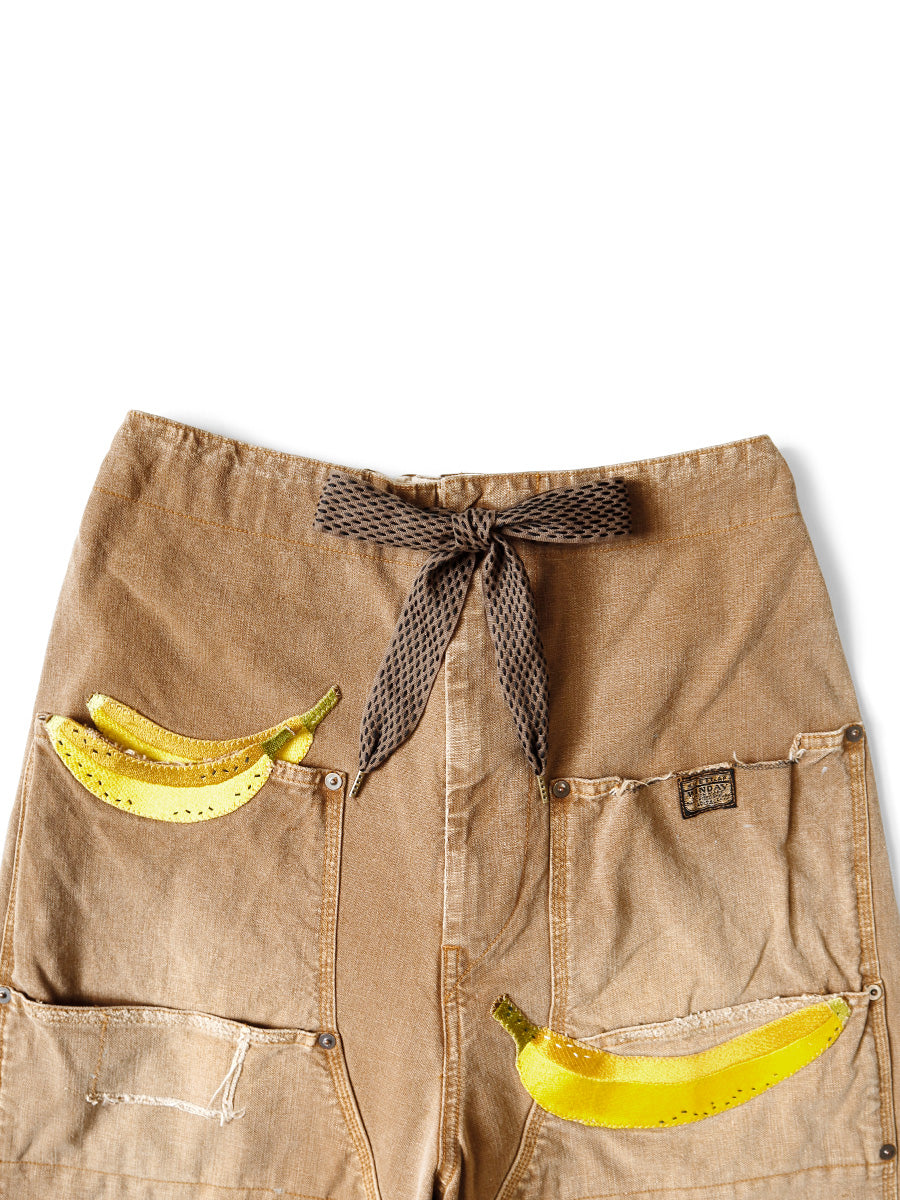 Buggy pants with double knee design. A design with hard processing such as fading, fraying, and paint on the canvas. The sewn banana patch is a pop accent. The waist is easy with elastic and string.