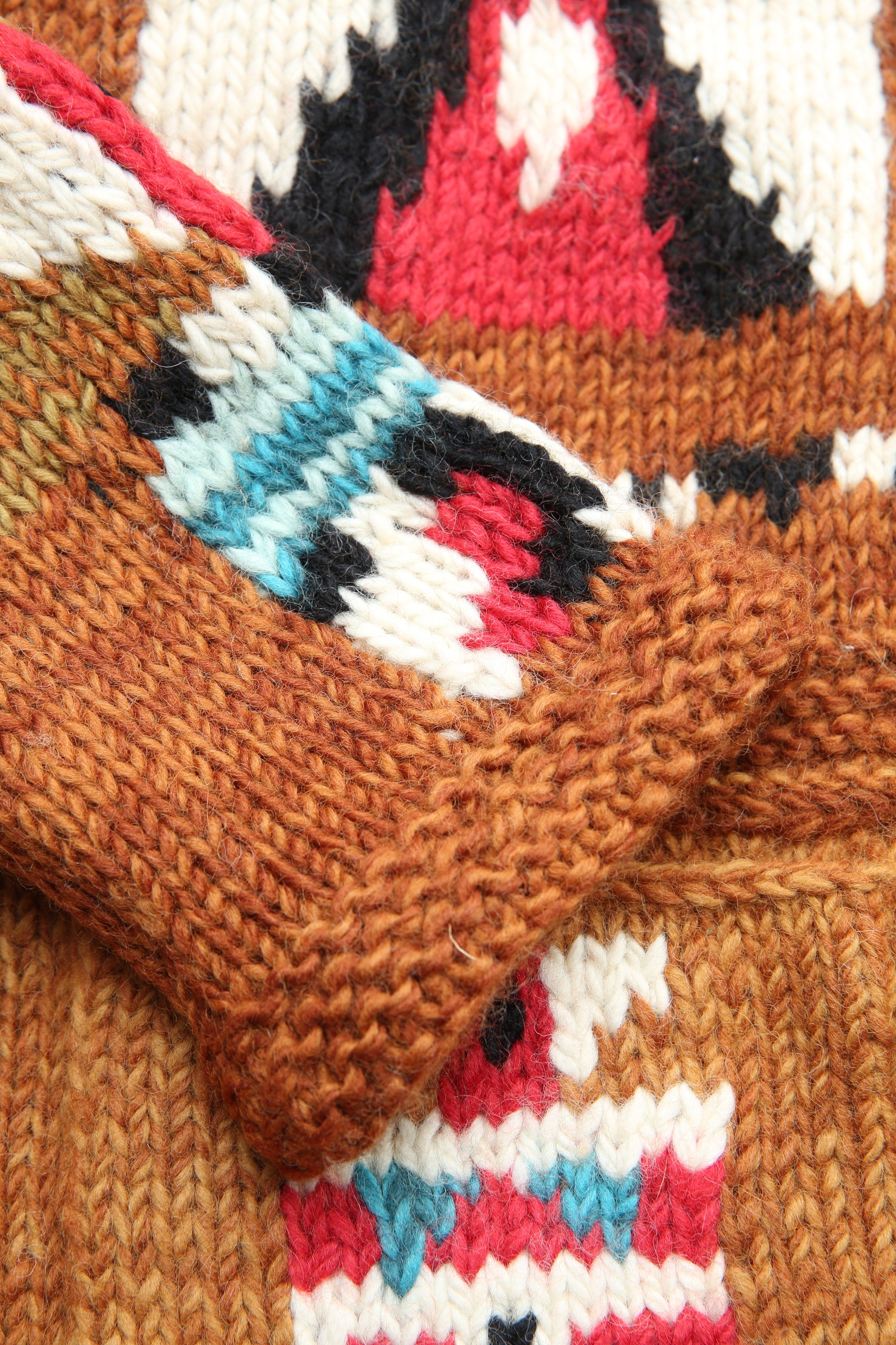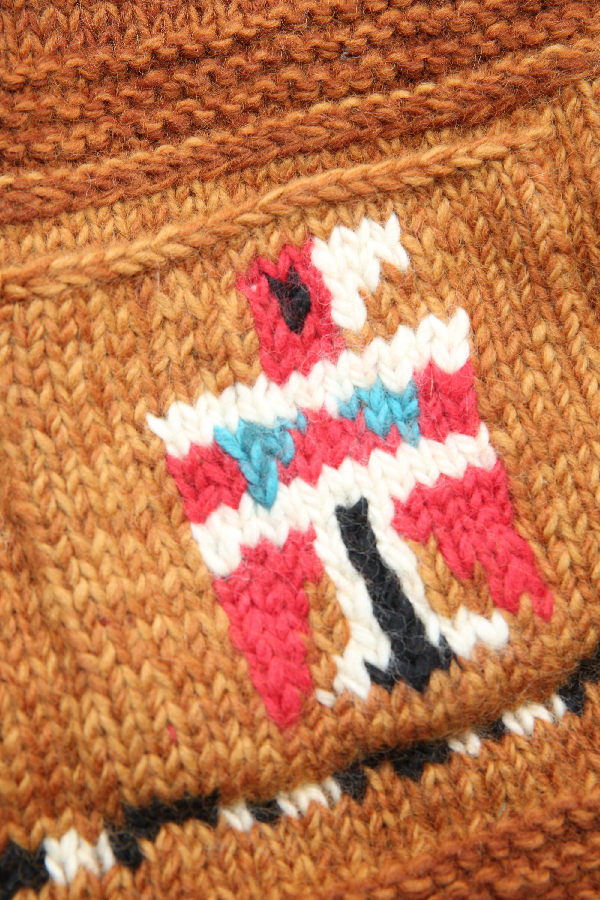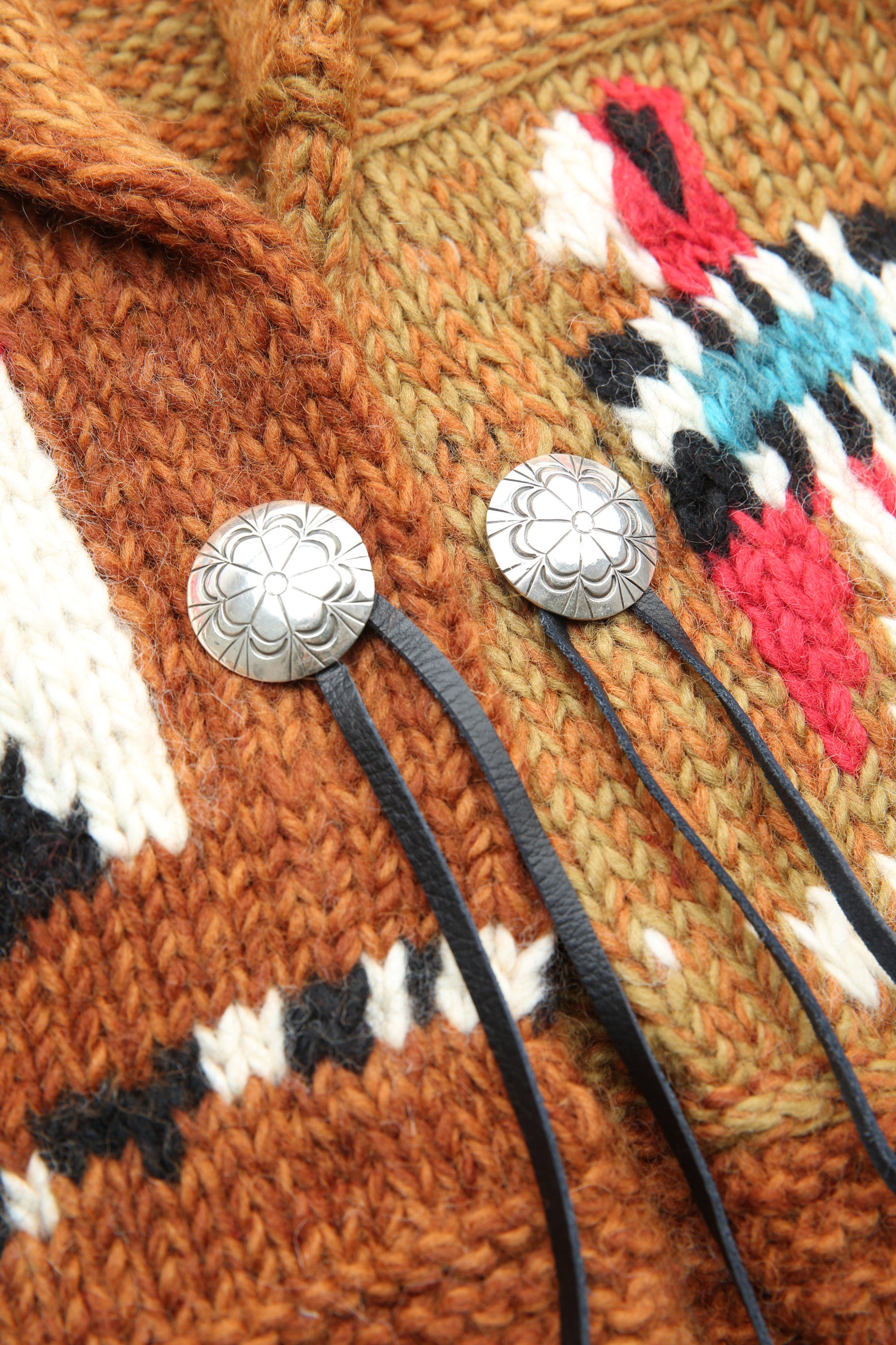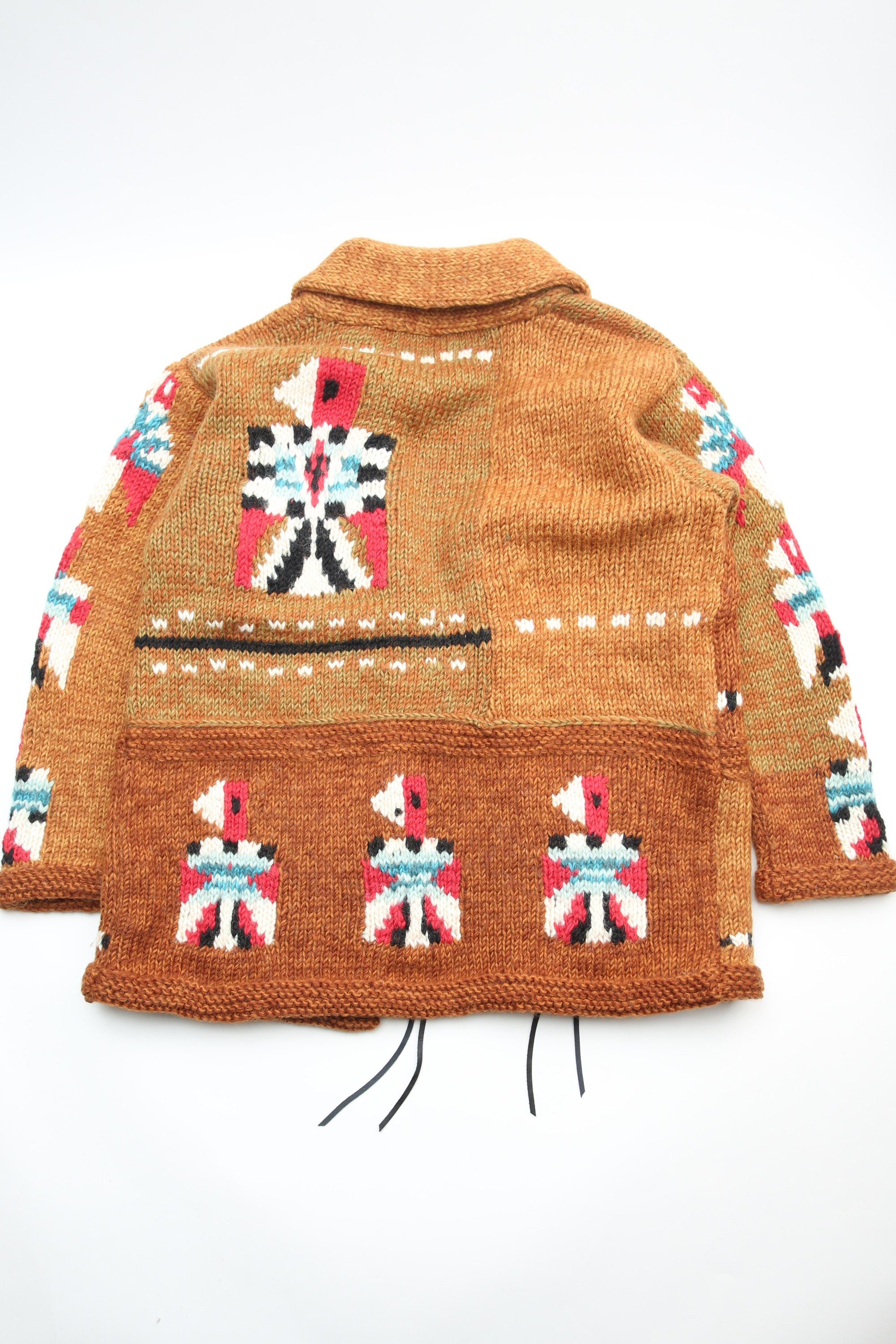 This Cowichan jacket has the warmth and simplicity of hand-knitted items. The front is fastened with a silver concho button wrapped in leather. It is made in a patchwork style and features a variety of Thunderbirds, large and small.