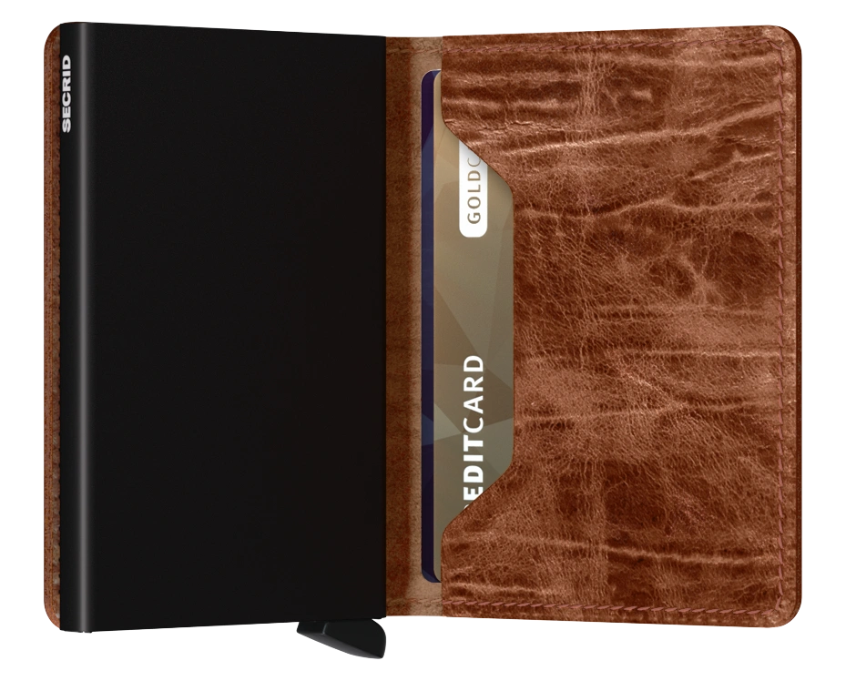 - Its slim profile makes the Slimwallet fit perfectly into every pocket. The open exterior is cut extra wide to hold cards, banknotes and receipts. The Cardprotector mechanism allows you to slide out cards with one simple motion, while the aluminium protects your cards from bending, breaking and unwanted wireless communication.