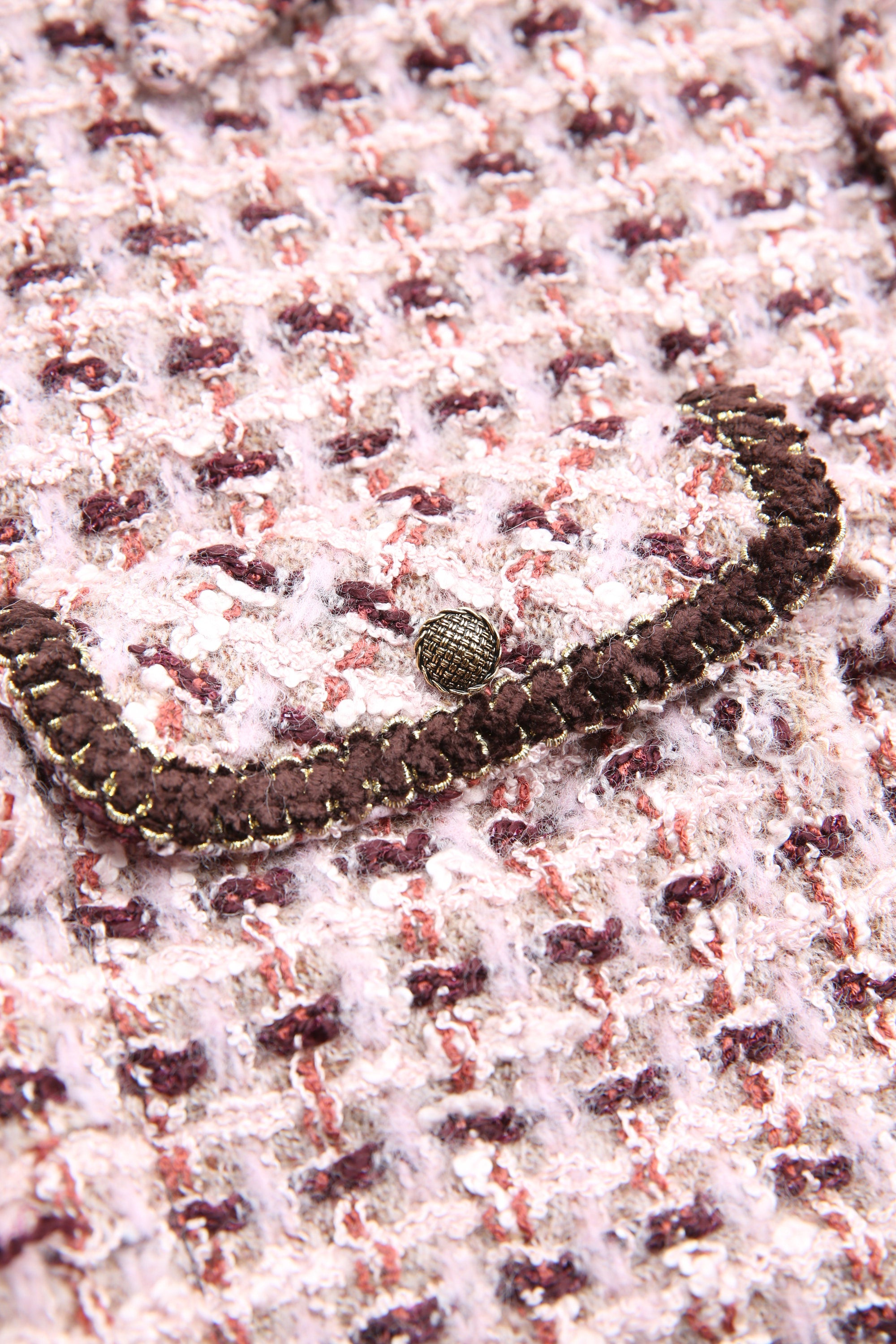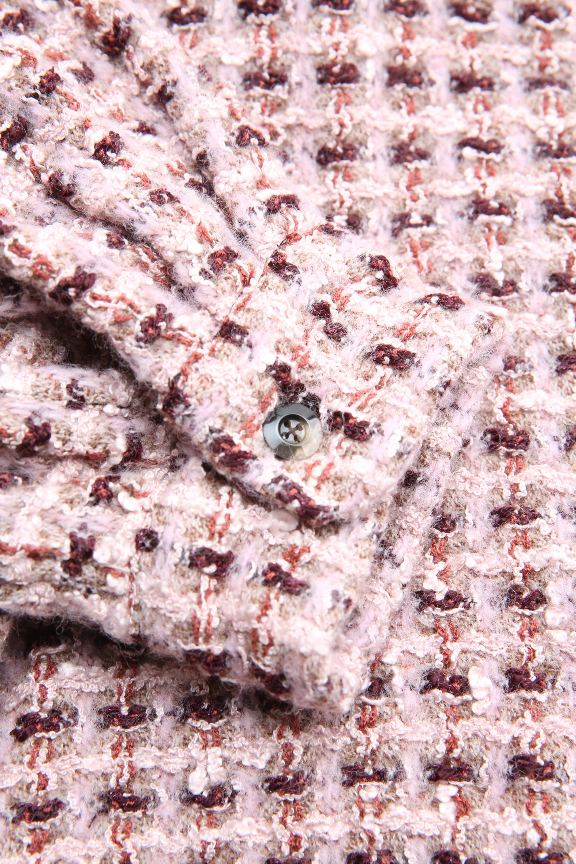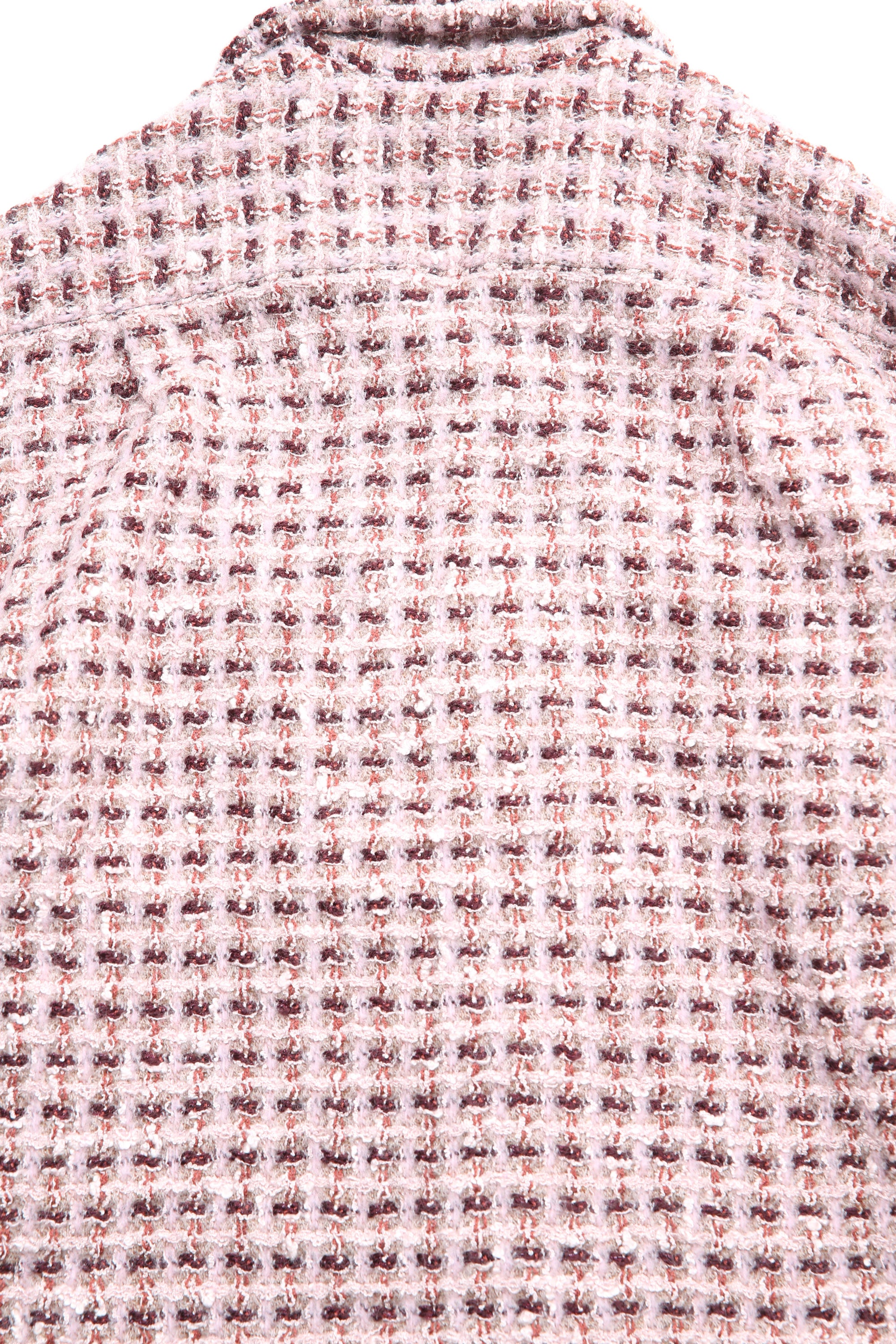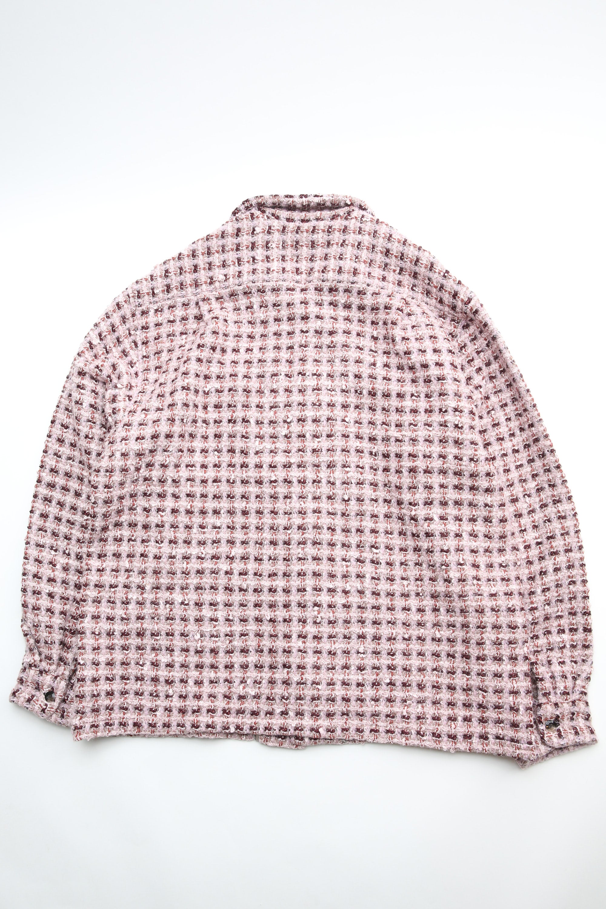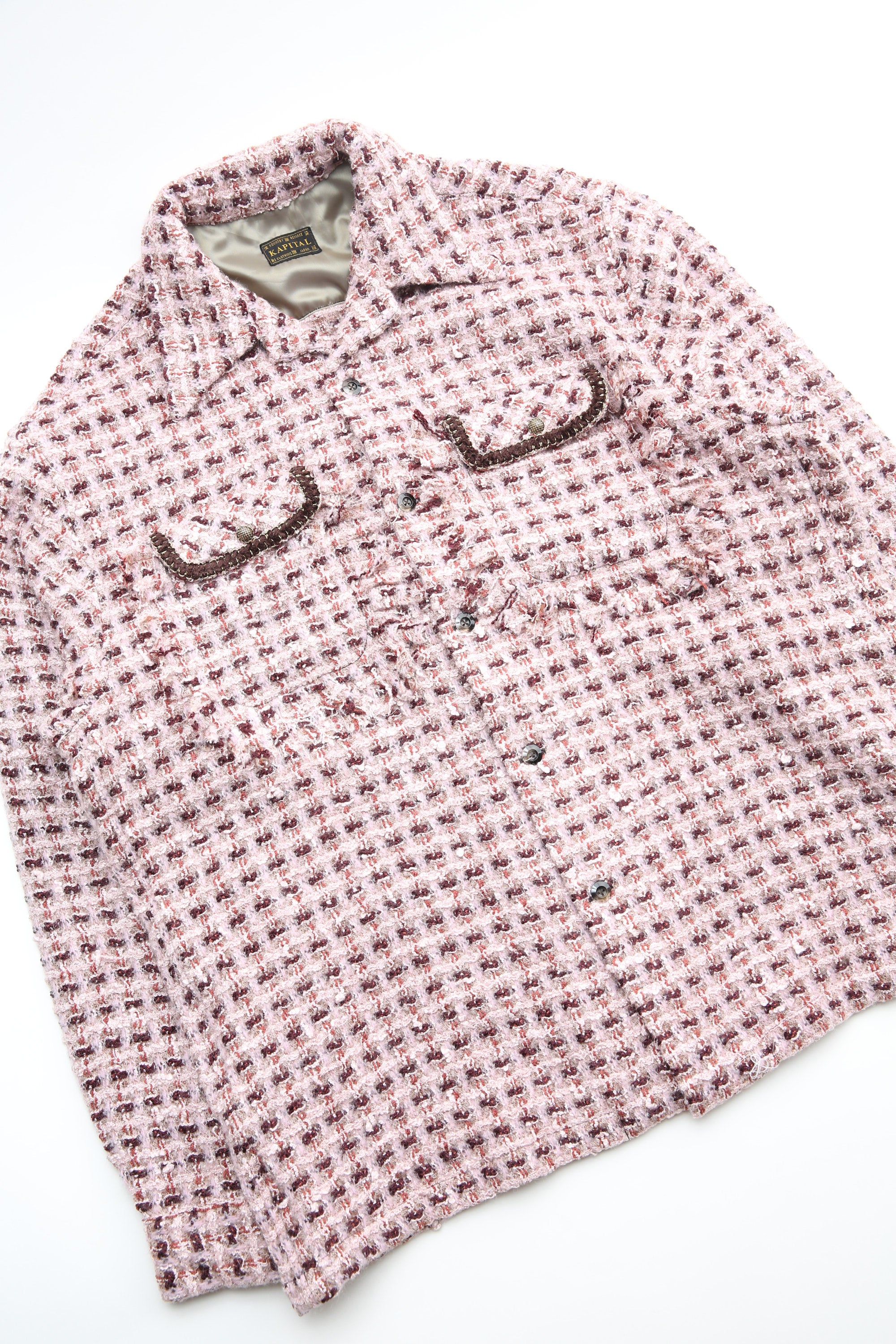 A board shirt with an open collar design and a boxy silhouette. Made from three-dimensional, luxurious fancy tweed fabric. The chest pocket has fringes, and the edges of the flap are decorated with glittery blades.