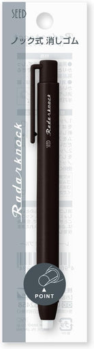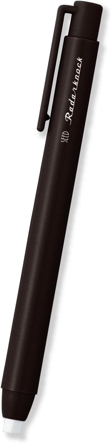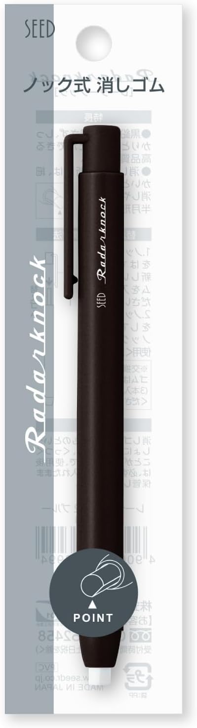 The Radar Knock 2 Eraser in black continues the legacy of the beloved "blue case eraser" from 1968 with its handy retractable design. Its half-moon shape makes erasing tiny details a breeze. This pack includes 10 replacement rubbers, each measuring 0.4 inches in diameter and 4.8 inches tall (10.5 x 122 mm), perfect for keeping your Radar Knock eraser ready for action!