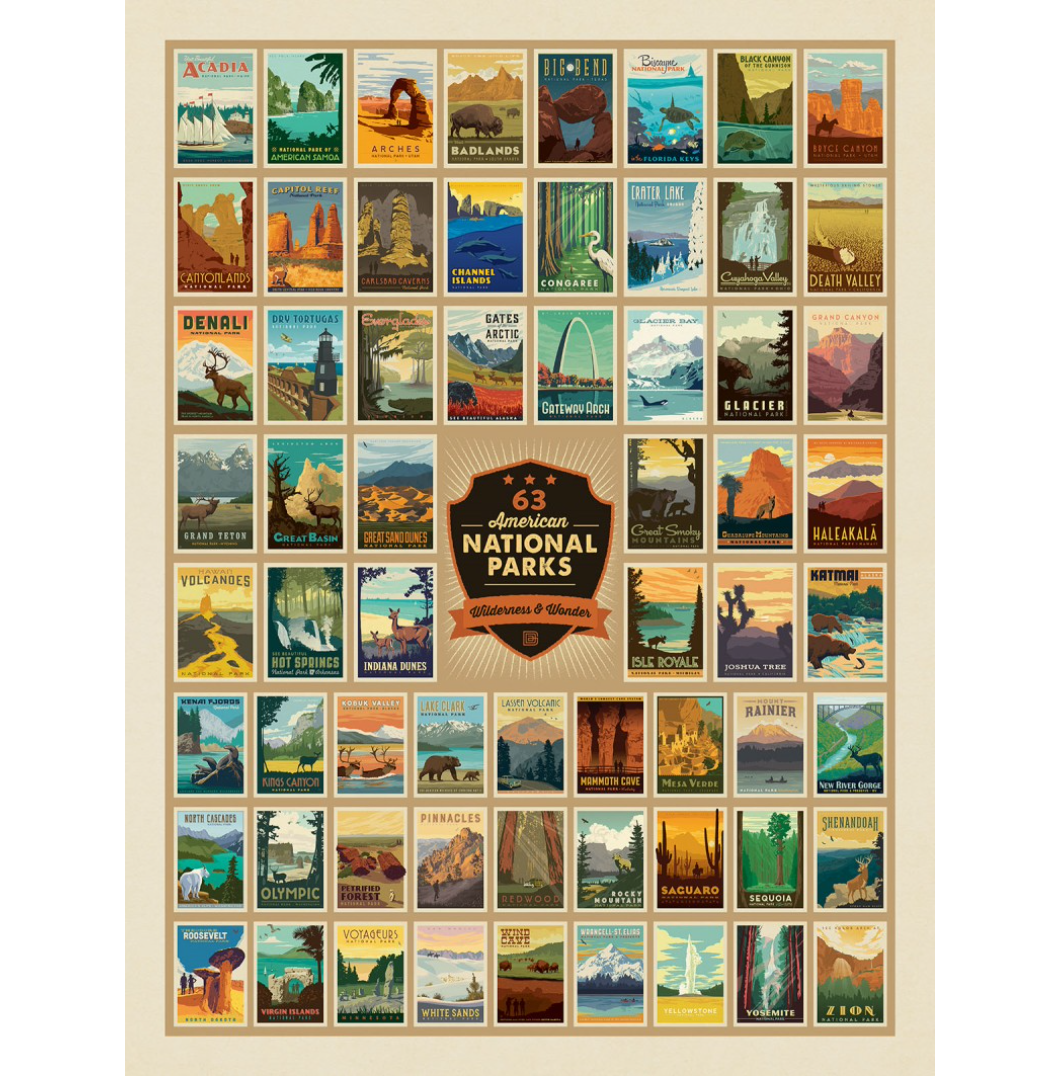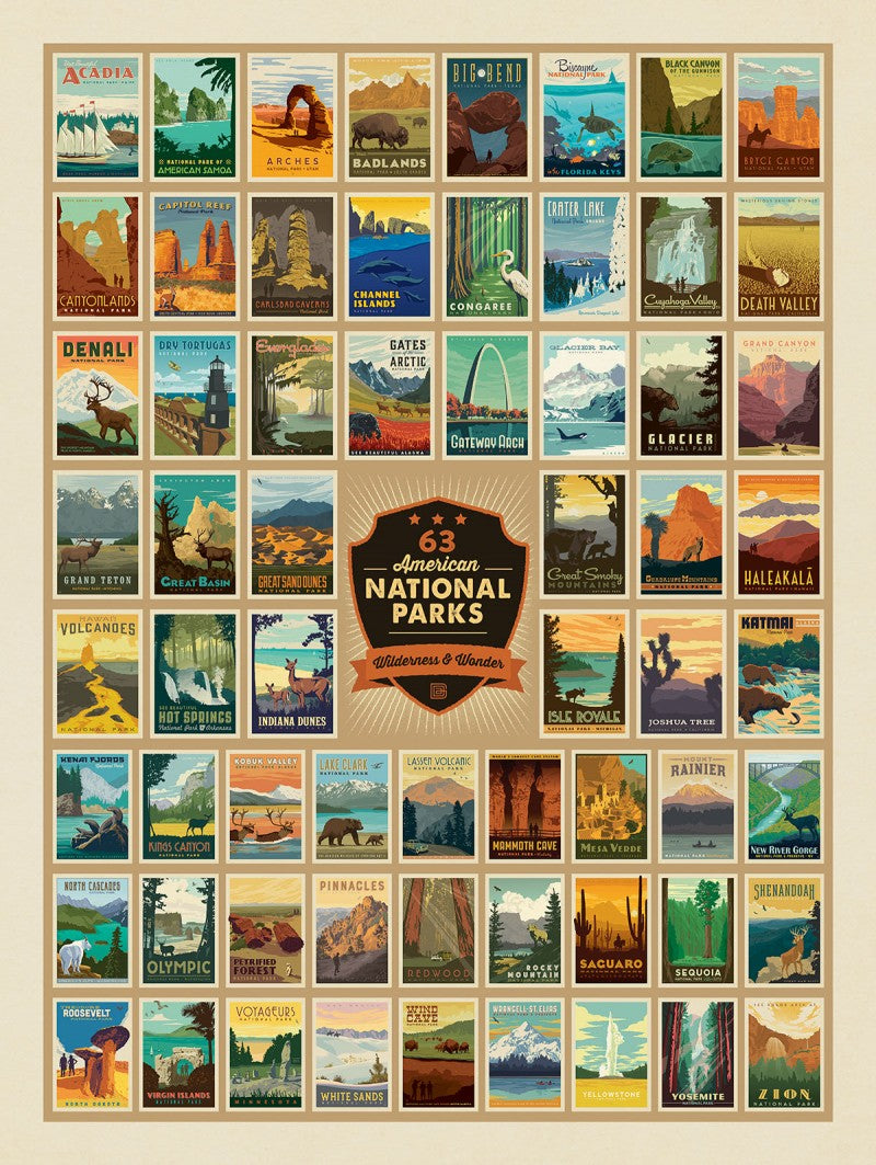 Newly updated to include America's 63rd National Park, this is an impressive compilation of Anderson Design Group's park prints. This vintage art poster can serve as a stylish bucket list for your walls! It is our gift to others who, like us, love the national parks. We’ve further customized this piece by offering it as a canvas banner, framed art piece, metal sign, notecard set, postcard set, or framed postcard. To show your support for the national parks and to learn more about them, take a look at the National Parks Conservation Association.