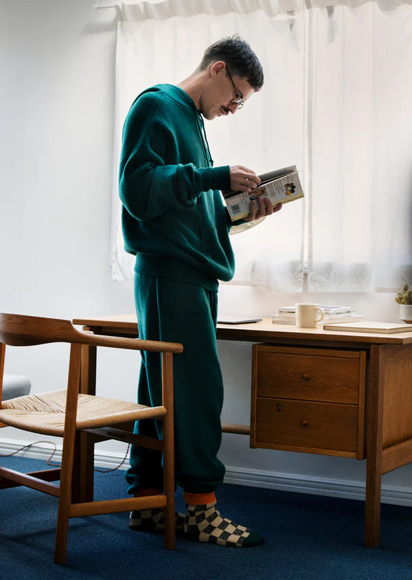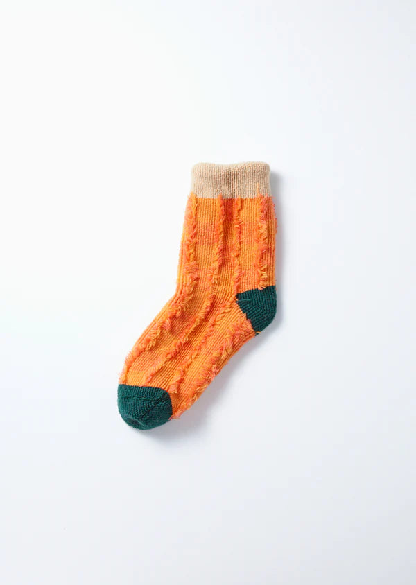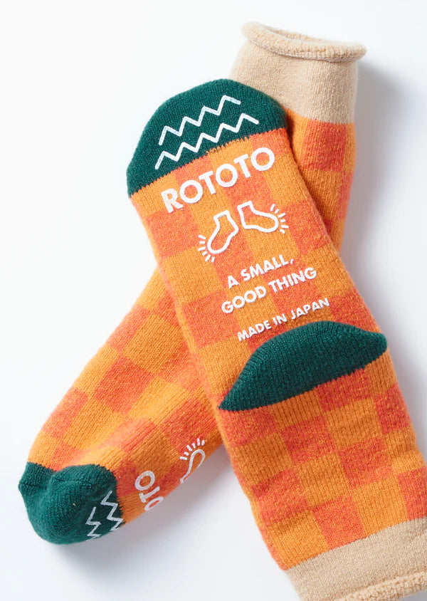 These room socks feature a striking, pop checkerboard pattern. Made with a wool and acrylic blend, the entire inside is finished with pile knitting for improved cushioning and warmth. The print on the sole provides a non-slip grip. *These socks are delicate. Please note that wearing them with stiff leather shoes may damage the fabric.