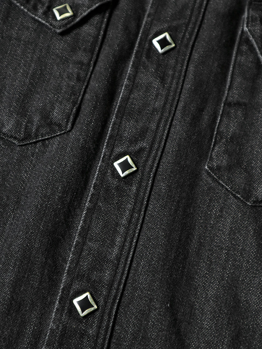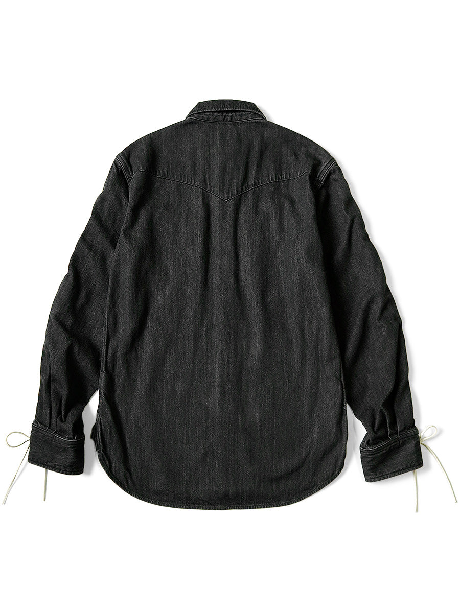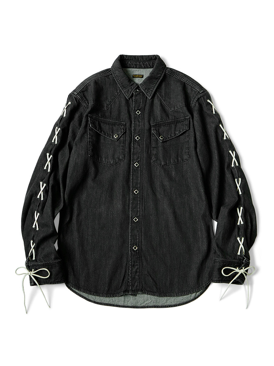 A western shirt made from light-ounce black denim that has undergone second-hand processing. It has a simple straight silhouette accented with lace-up sleeves and diamond-shaped dot buttons.