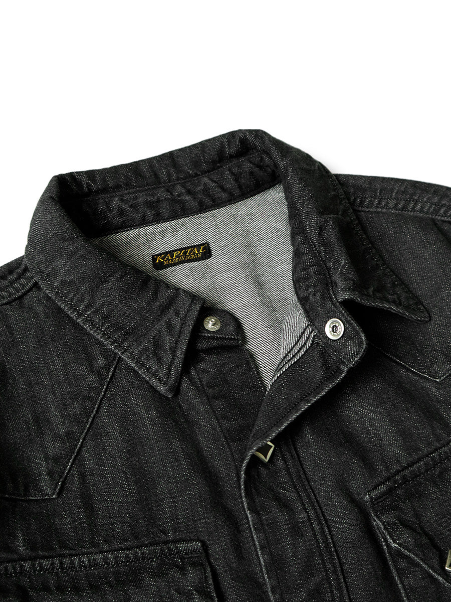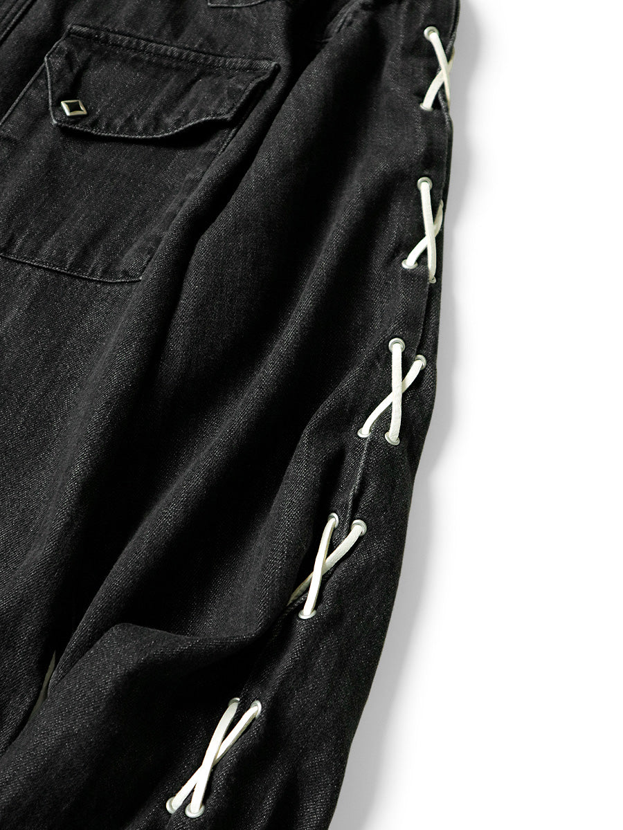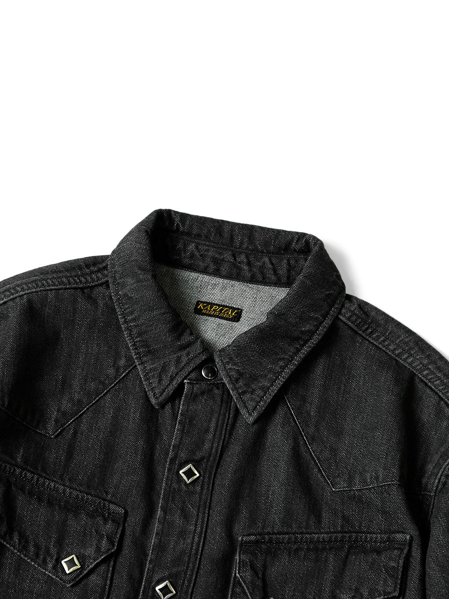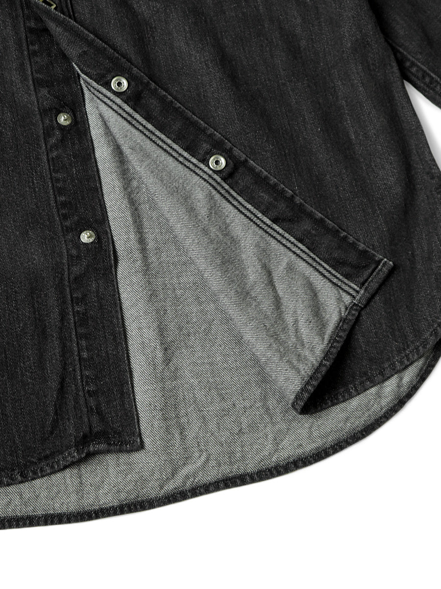 A western shirt made from light-ounce black denim that has undergone second-hand processing. It has a simple straight silhouette accented with lace-up sleeves and diamond-shaped dot buttons.
