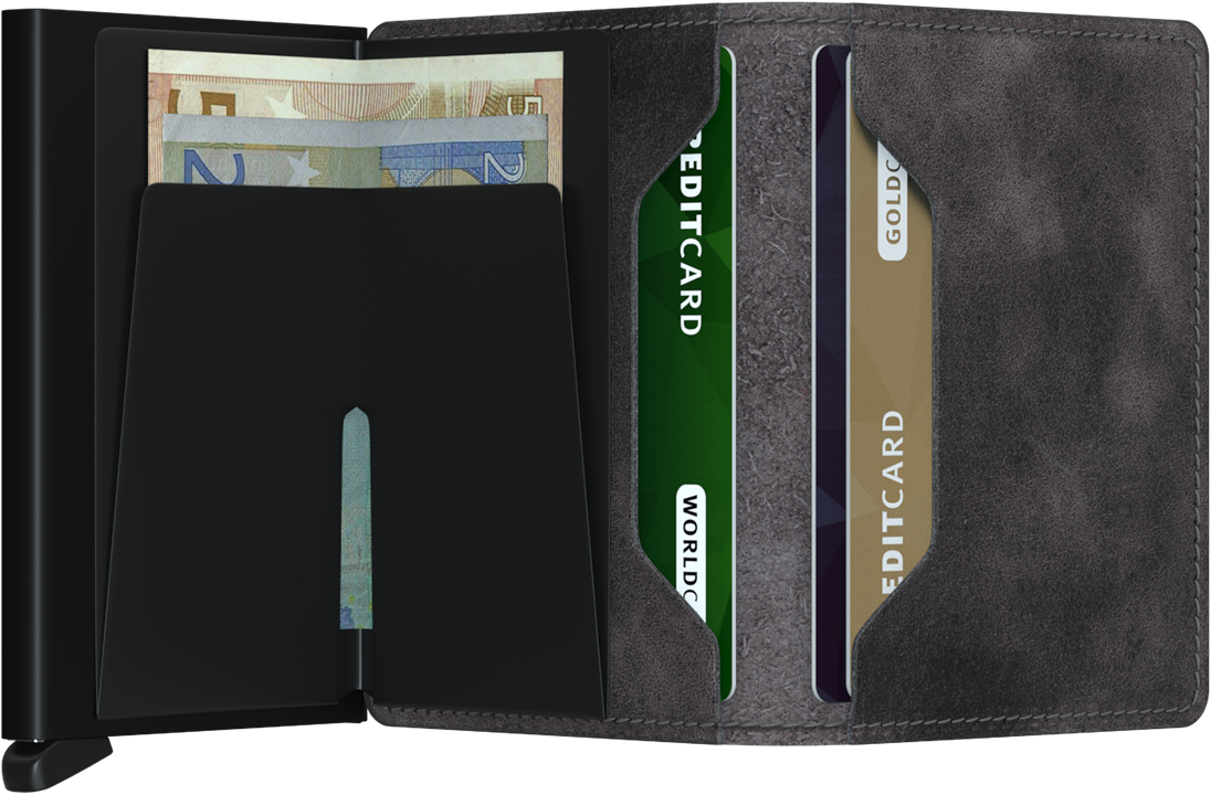 Unlike the Miniwallet the Slimwallet does not have a press stud toggle, making it even slimmer. Due to this size it fits perfectly into the breast pocket of a jacket. Since the Slimwallet’s casing has a wider cut, the wallet offers space for at least an additional six cards, cash and business cards in its leather interior.