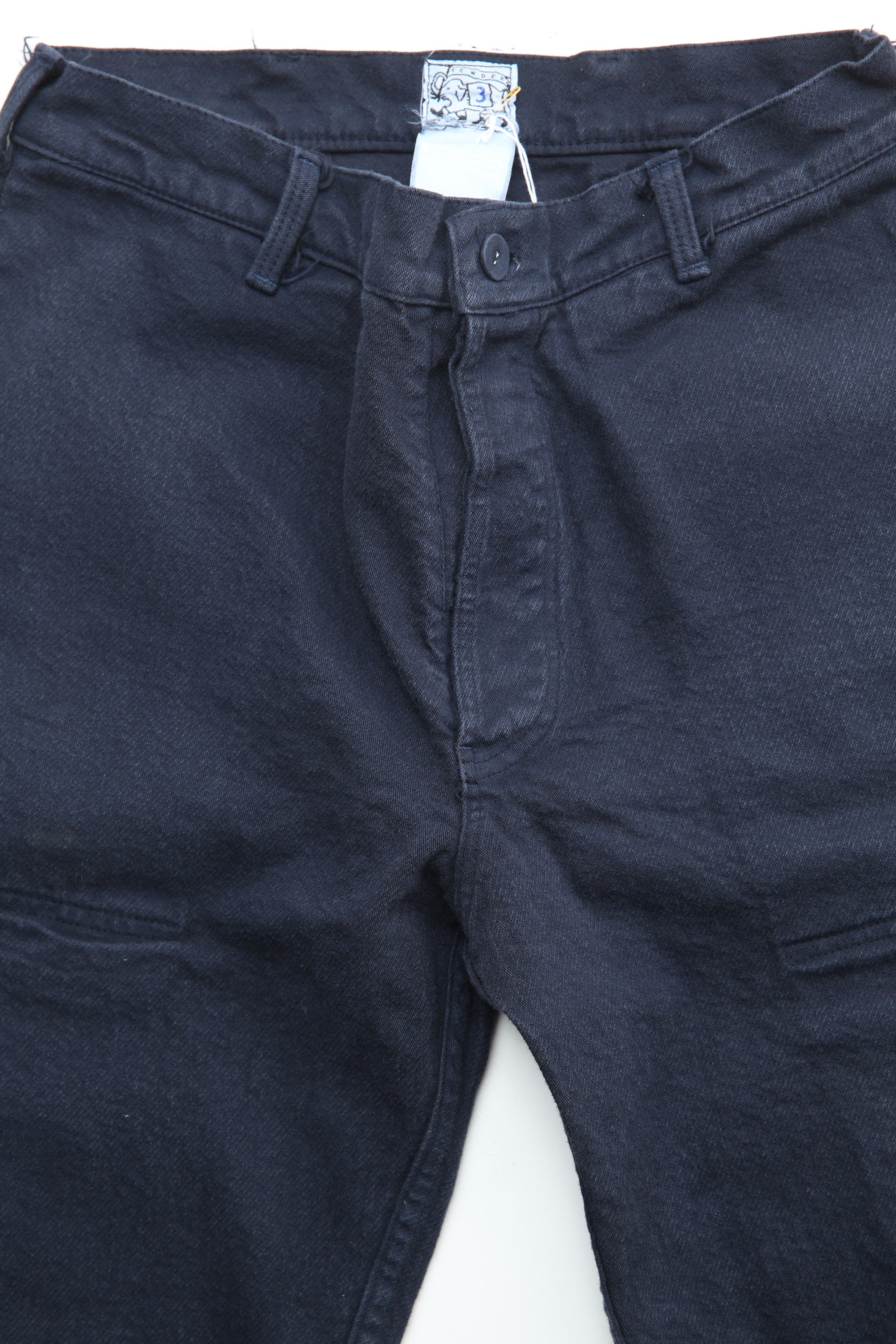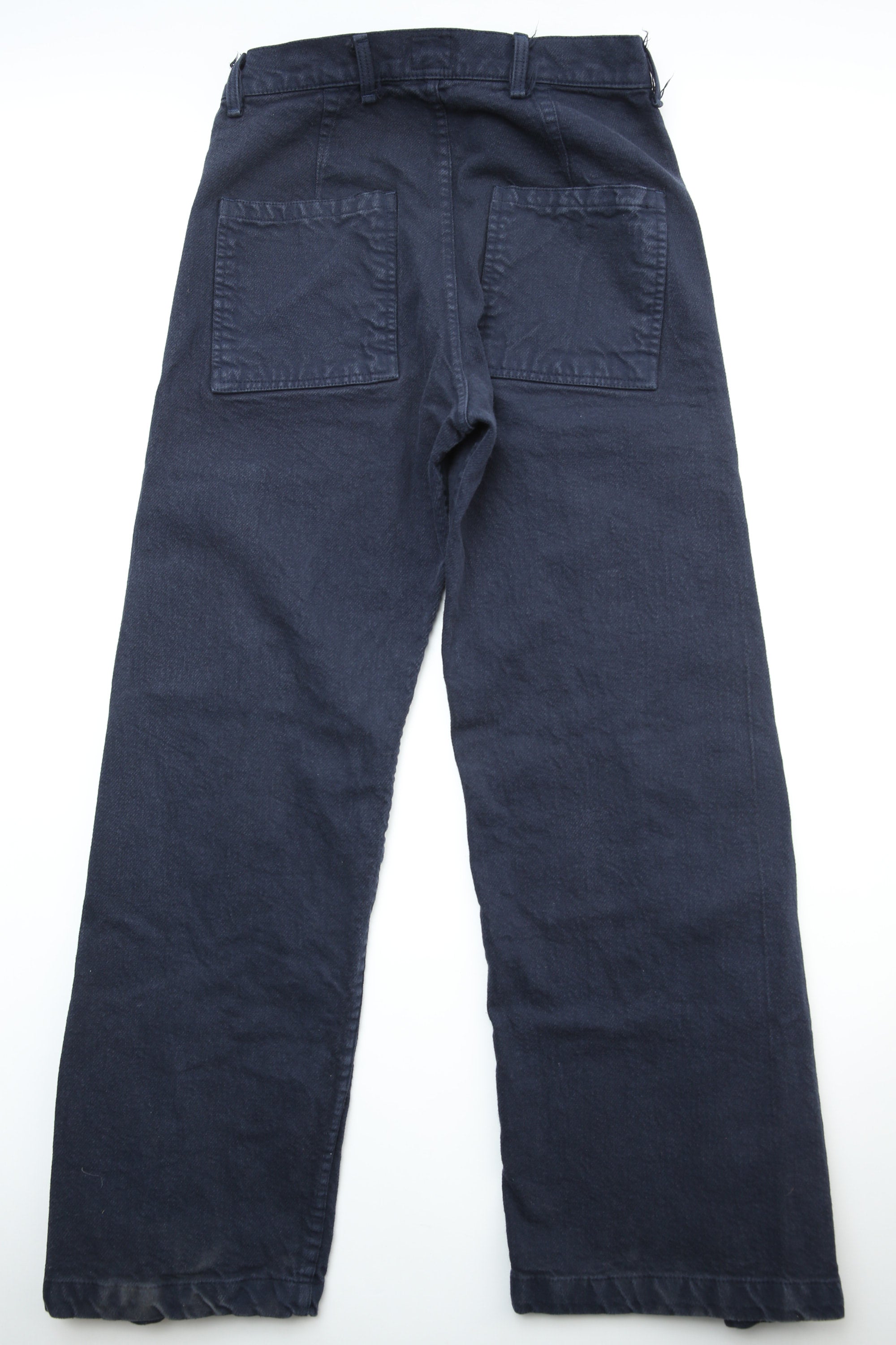 Pleat Pocket Bags are made up with patch hip pockets, back darts, and a button fly. They