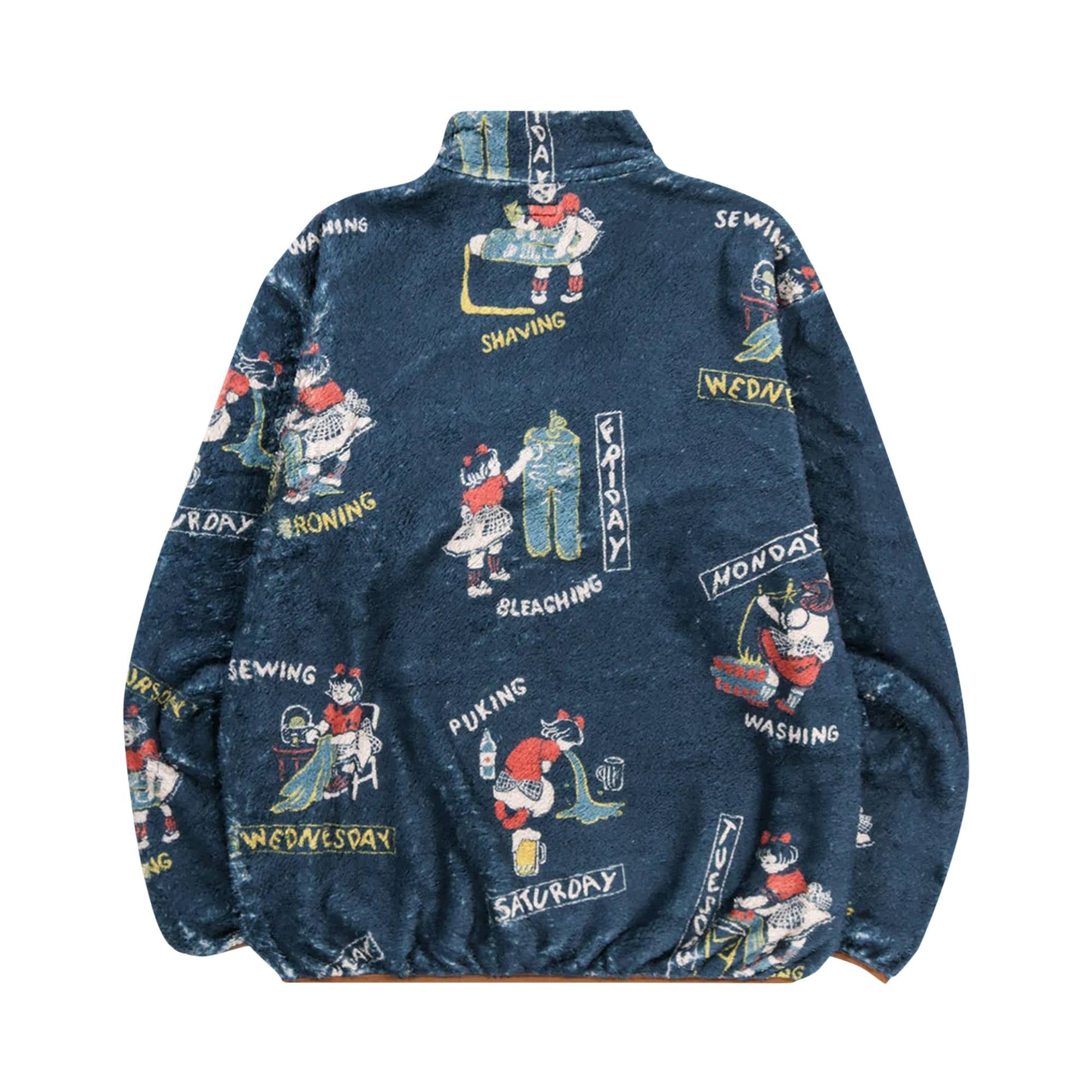 The KAPITAL 'Kountry Calendar' sweatshirt features a charming design illustrating different weekly activities. Crafted from soft fleece, it offers a relaxed and comfortable fit.