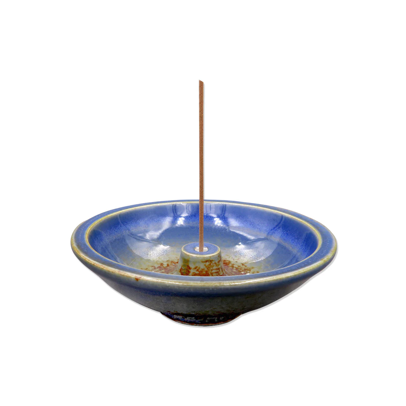 Our 4.5" hand-thrown ceramic wheel incense holders can be considered our most popular incense holders. A single hole for stick incense In the center of a broad, ash-catching surface. Cone and coil incense can also be enjoyed with this style of holder.