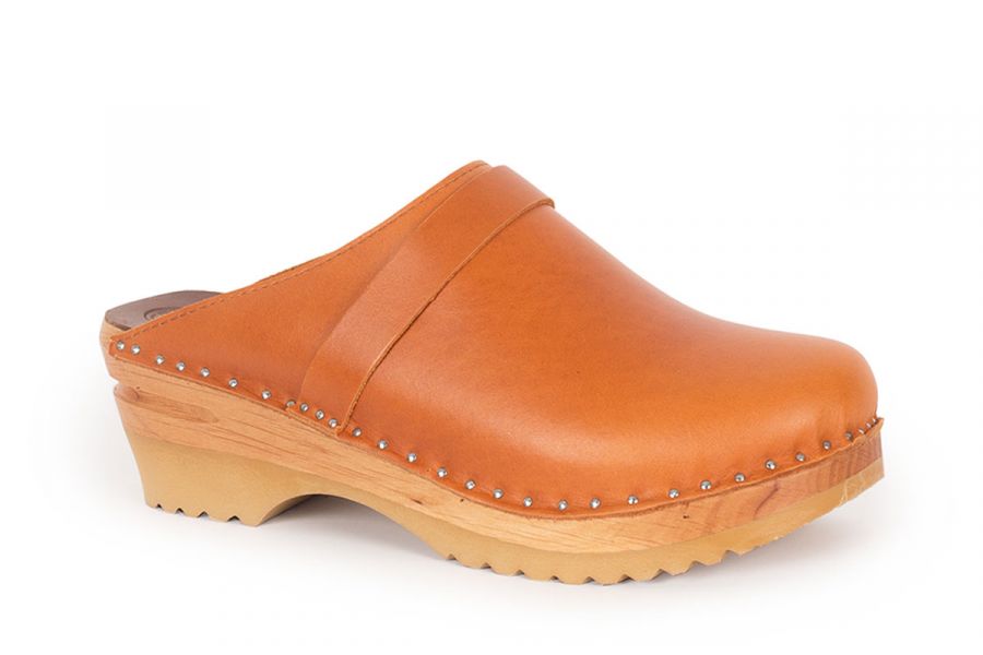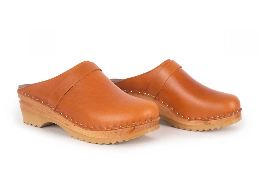 Classic Swedish clog style in cognac brown pull up leather. Made on our varnished Ideal wooden clog bottoms.