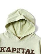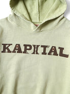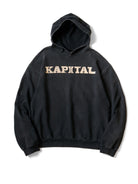 This hooded sweatshirt features a soft fleece fabric and is adorned with the KAPITAL logo, enhanced by an intricate eye pattern. The garment has been thoughtfully treated to achieve a vintage, worn-in appearance. Any intentional distressing or imperfections are part of the design and do not indicate flaws.