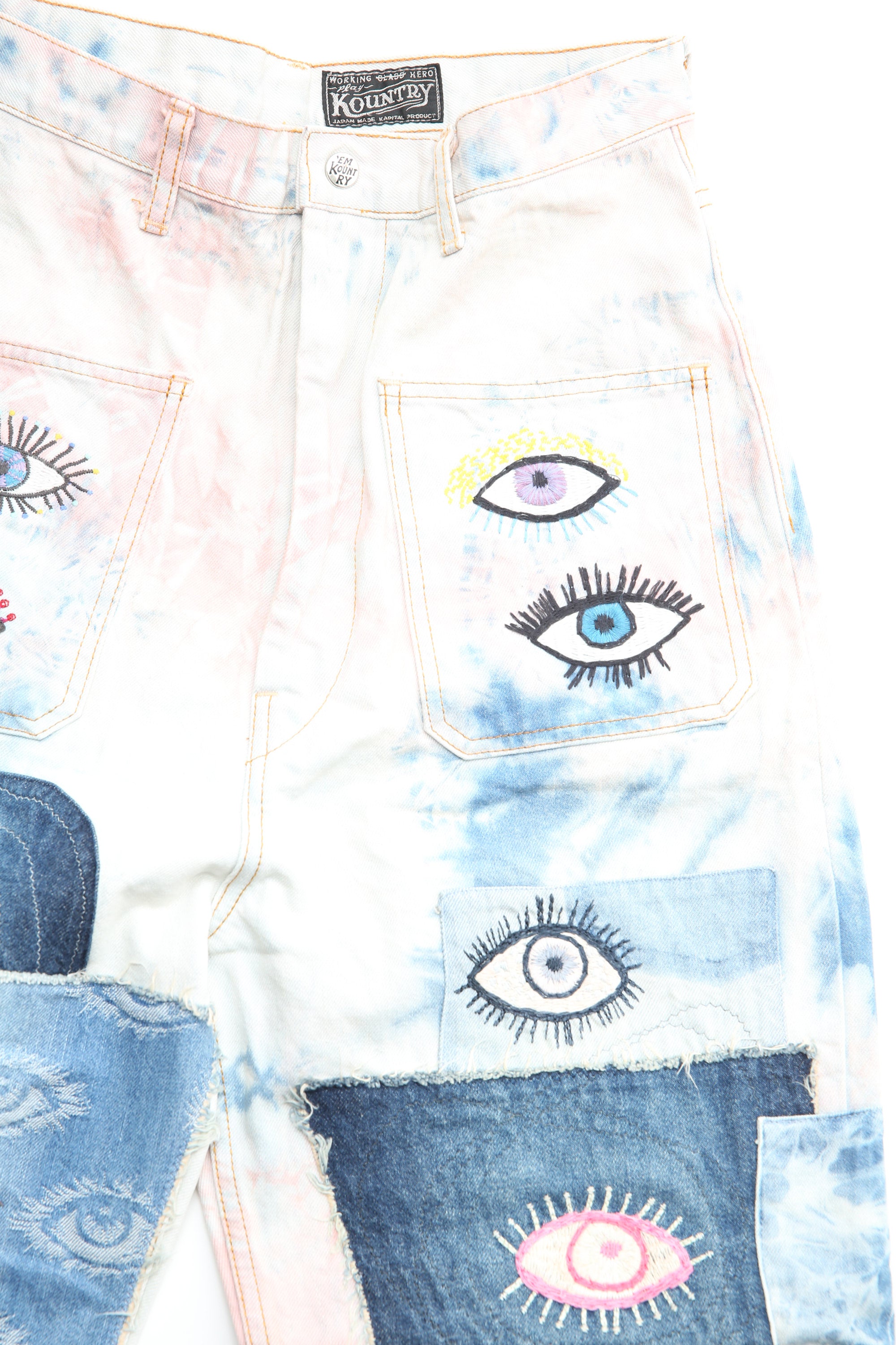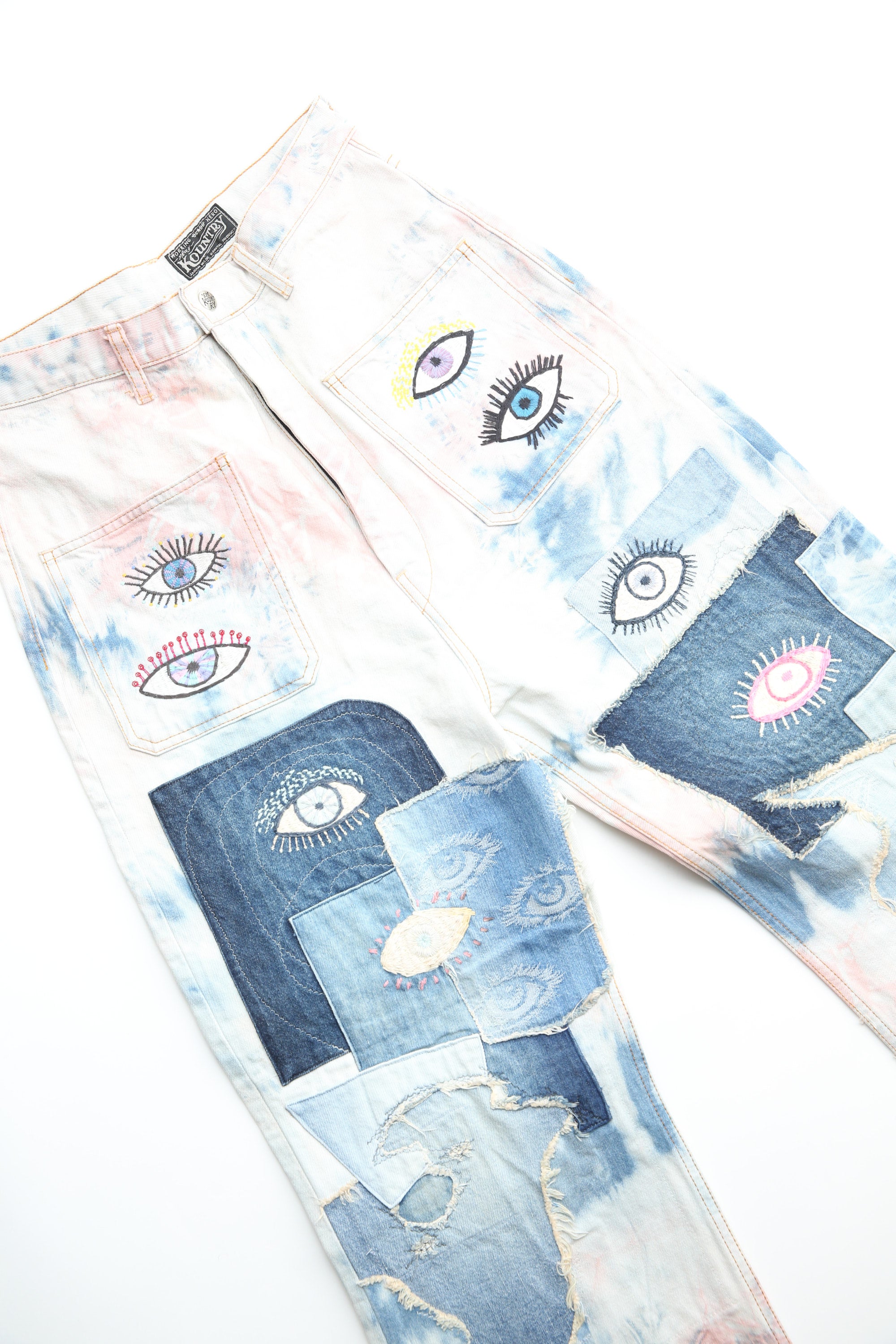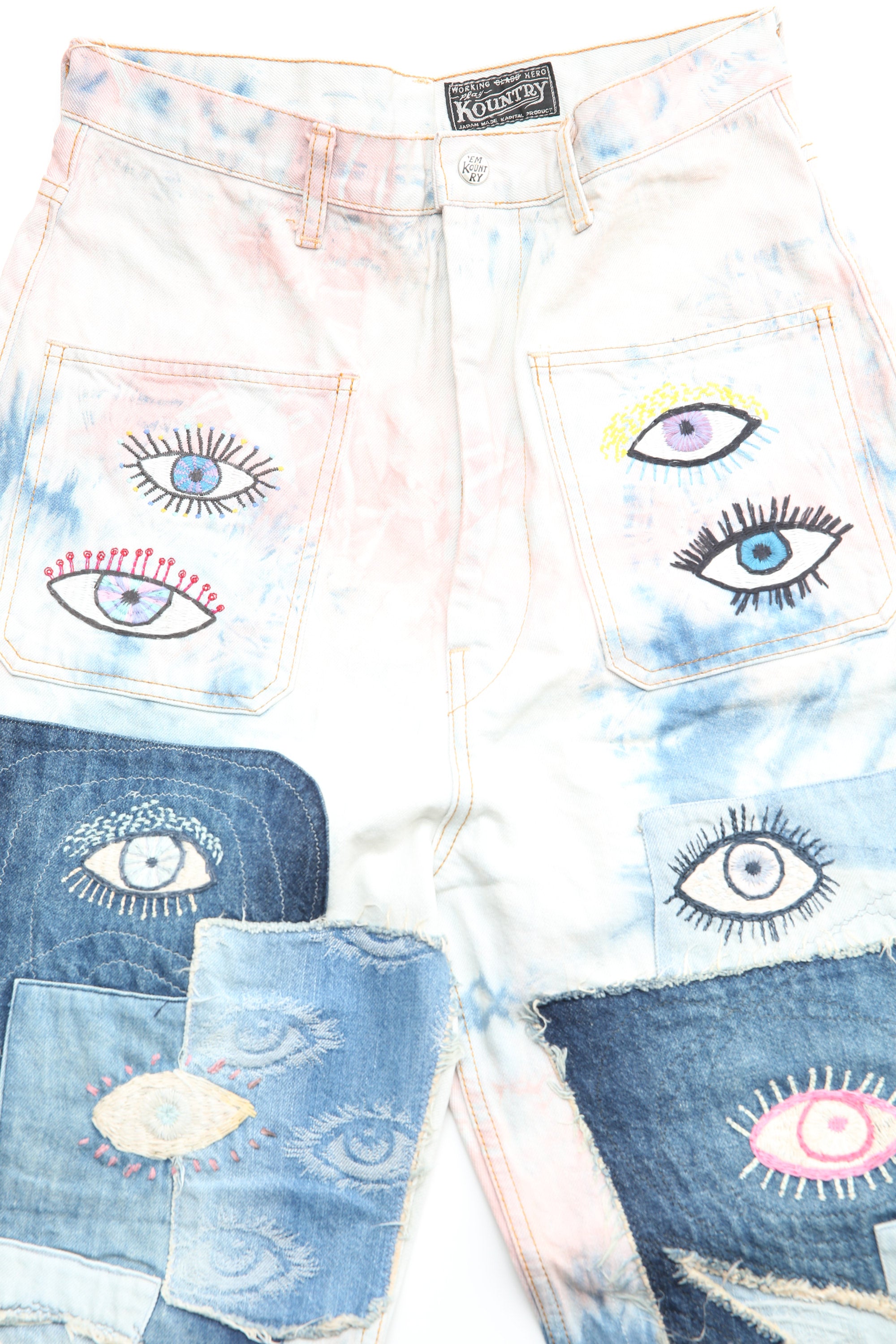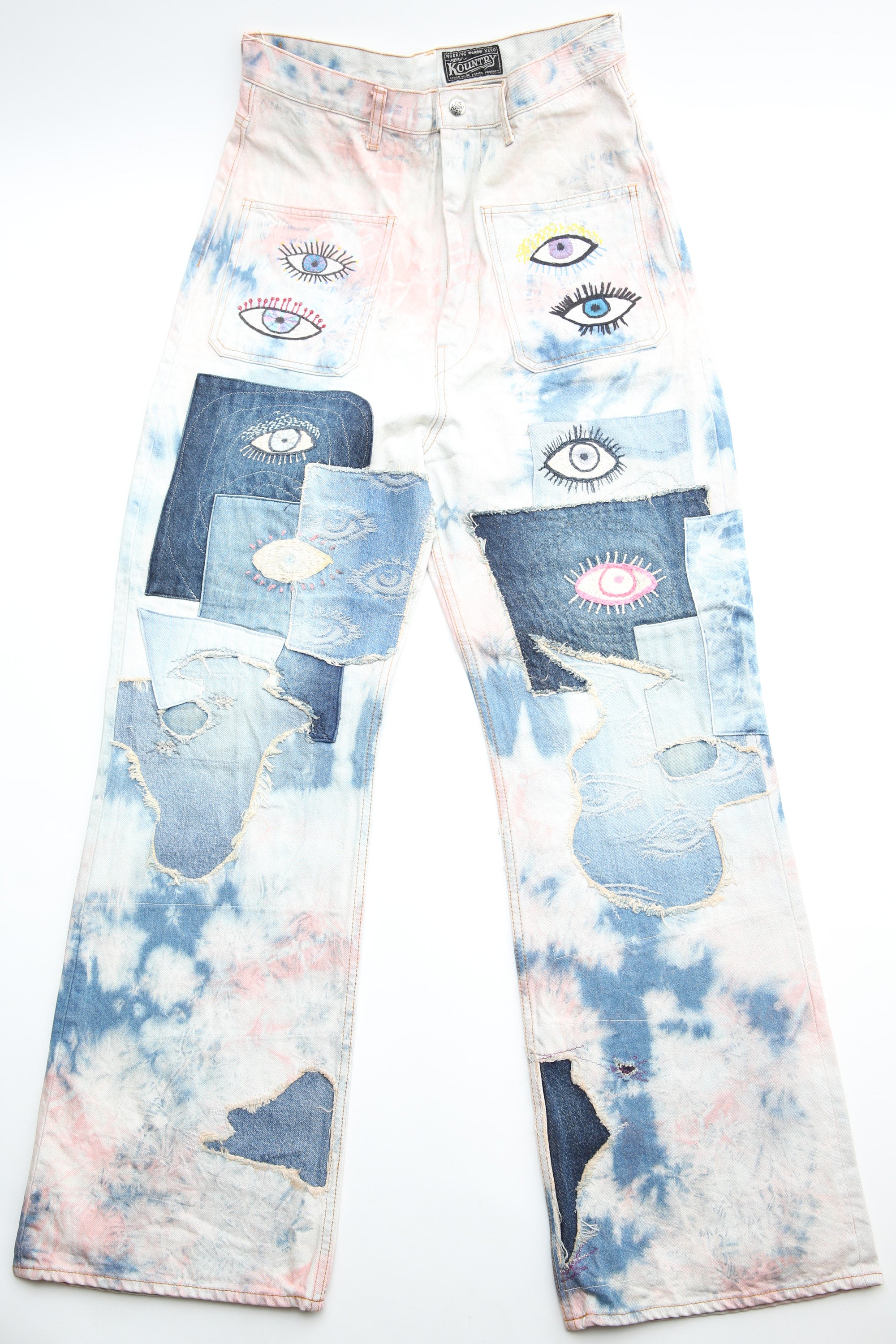 Get ready to turn heads with Kapital's 14oz Denim Tie-Dye Baggy Flare Pants! These eye-catching pants feature an all-over eyes patchwork design and distressed details. Perfect for the fashion-forward and quirky individual. (Pun intended!)