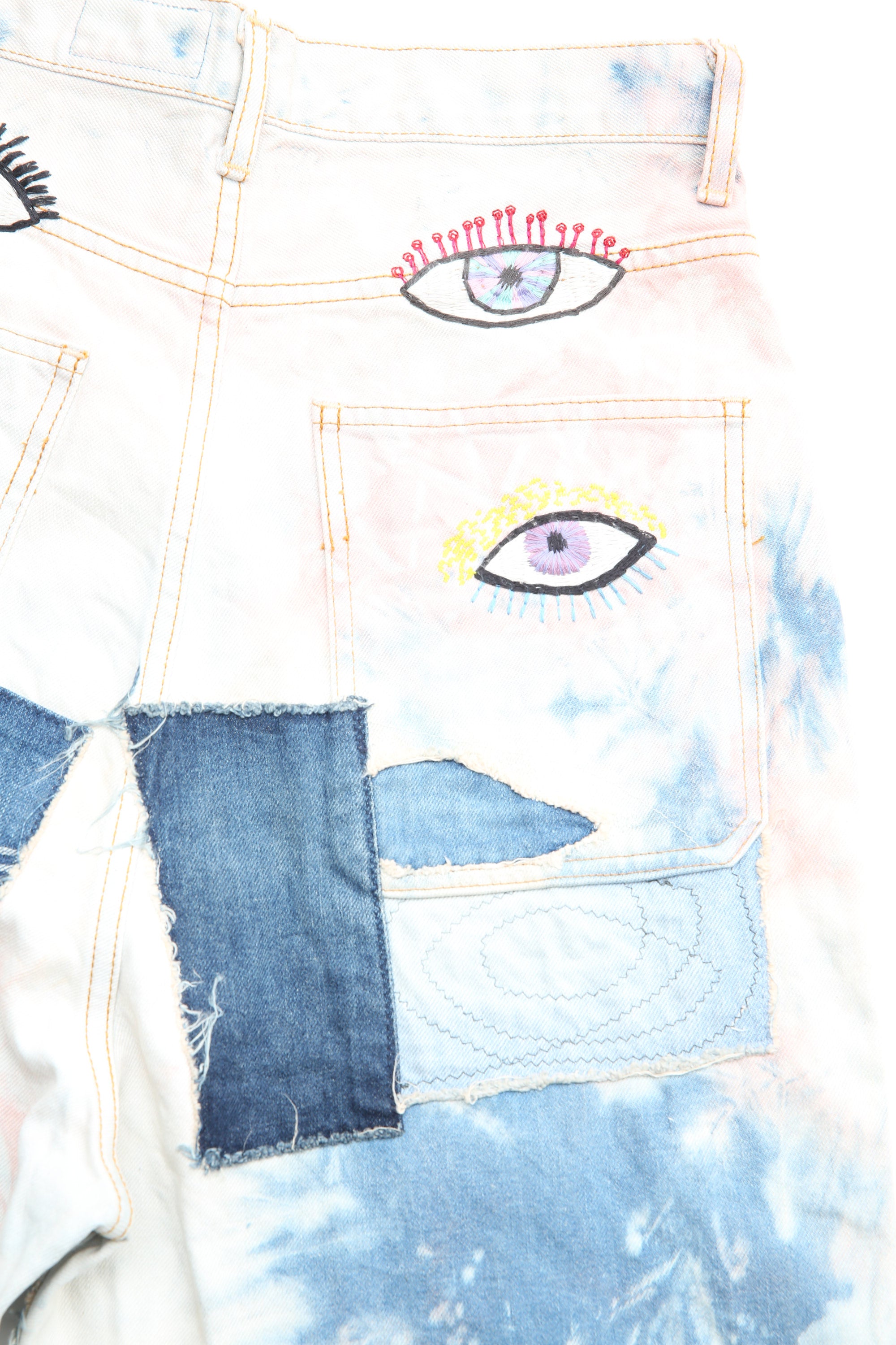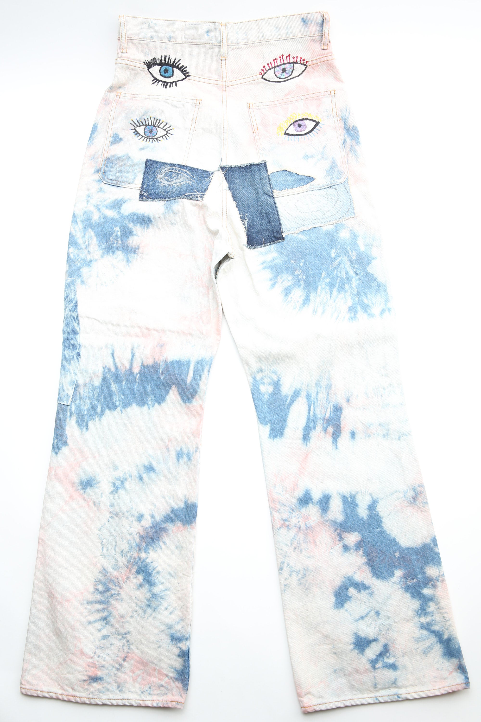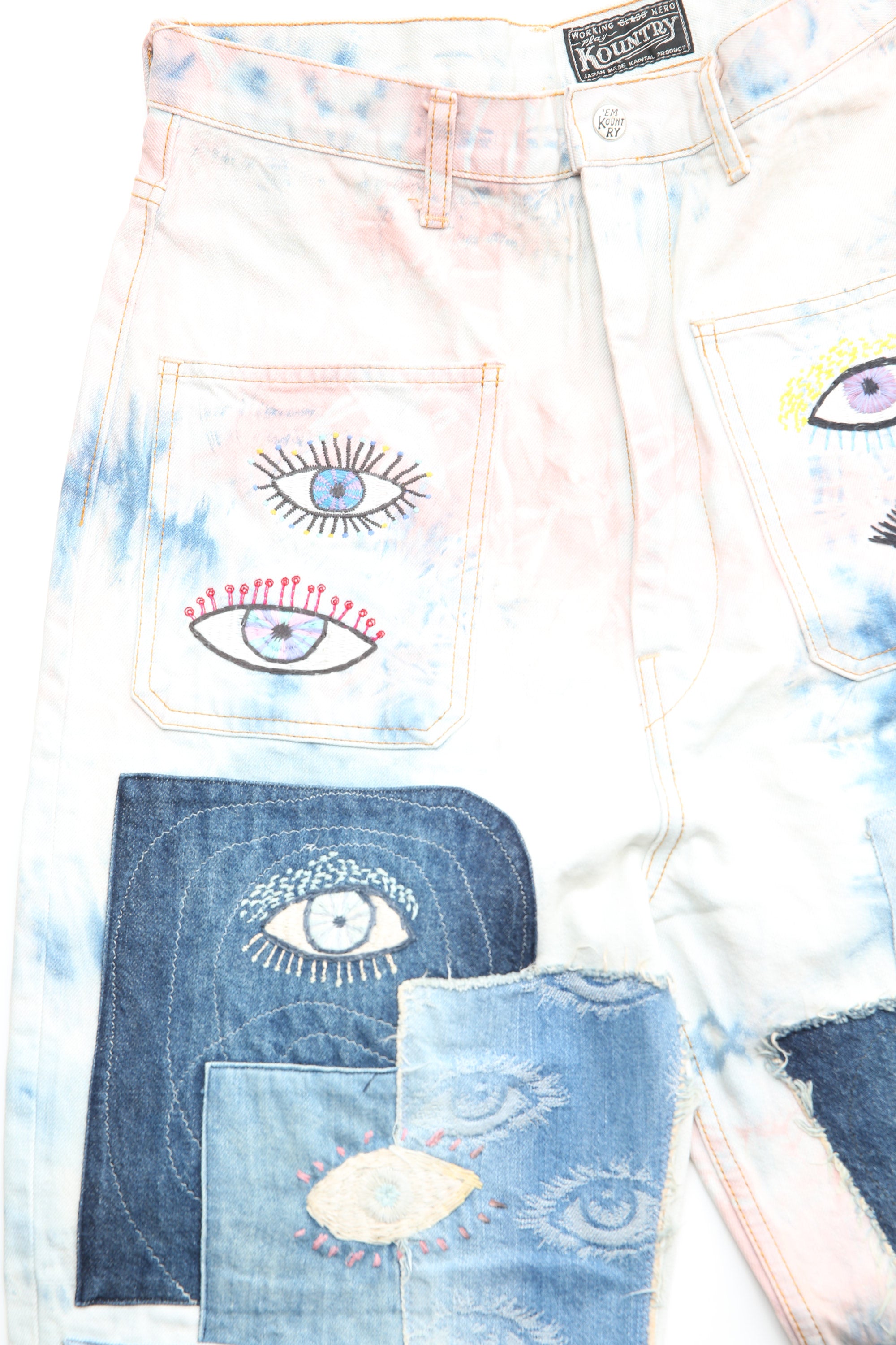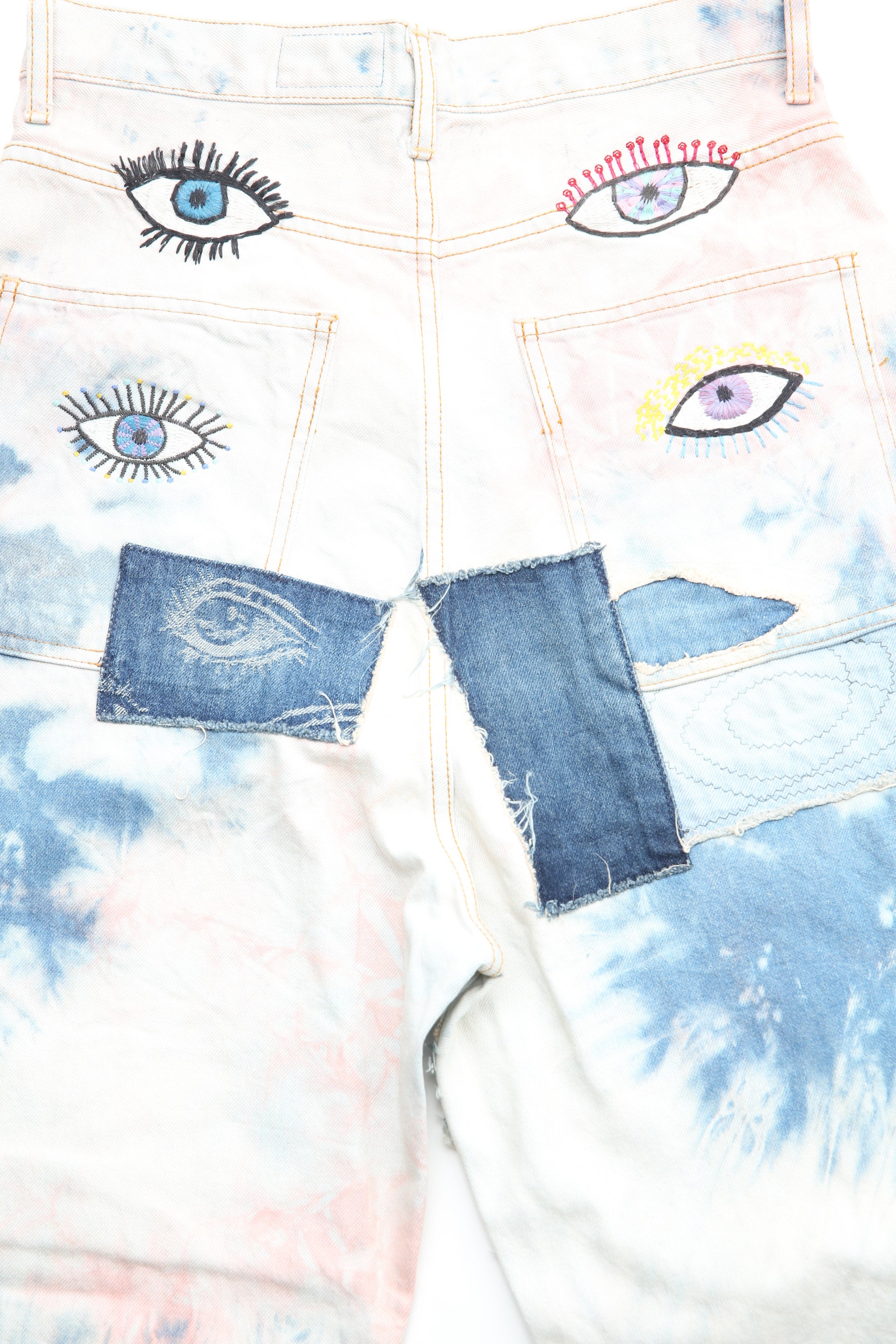 Get ready to turn heads with Kapital's 14oz Denim Tie-Dye Baggy Flare Pants! These eye-catching pants feature an all-over eyes patchwork design and distressed details. Perfect for the fashion-forward and quirky individual. (Pun intended!)