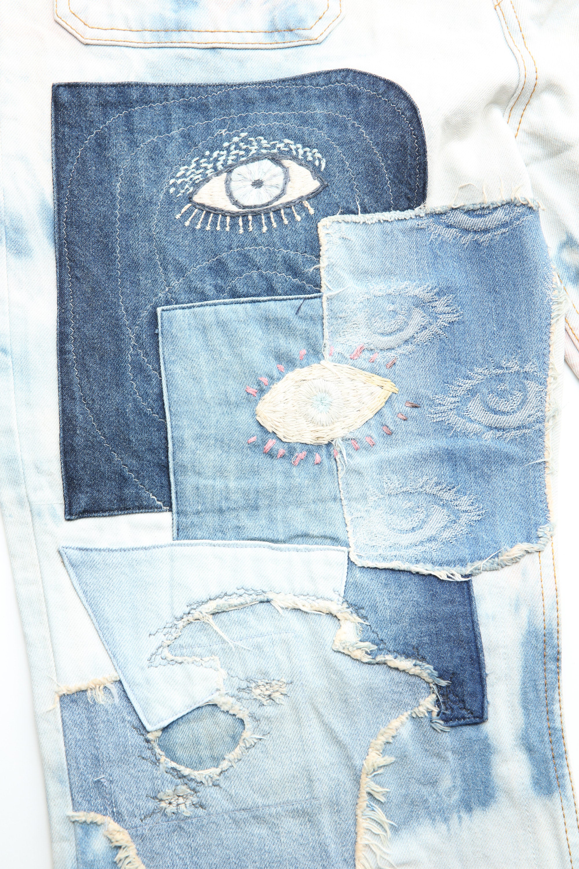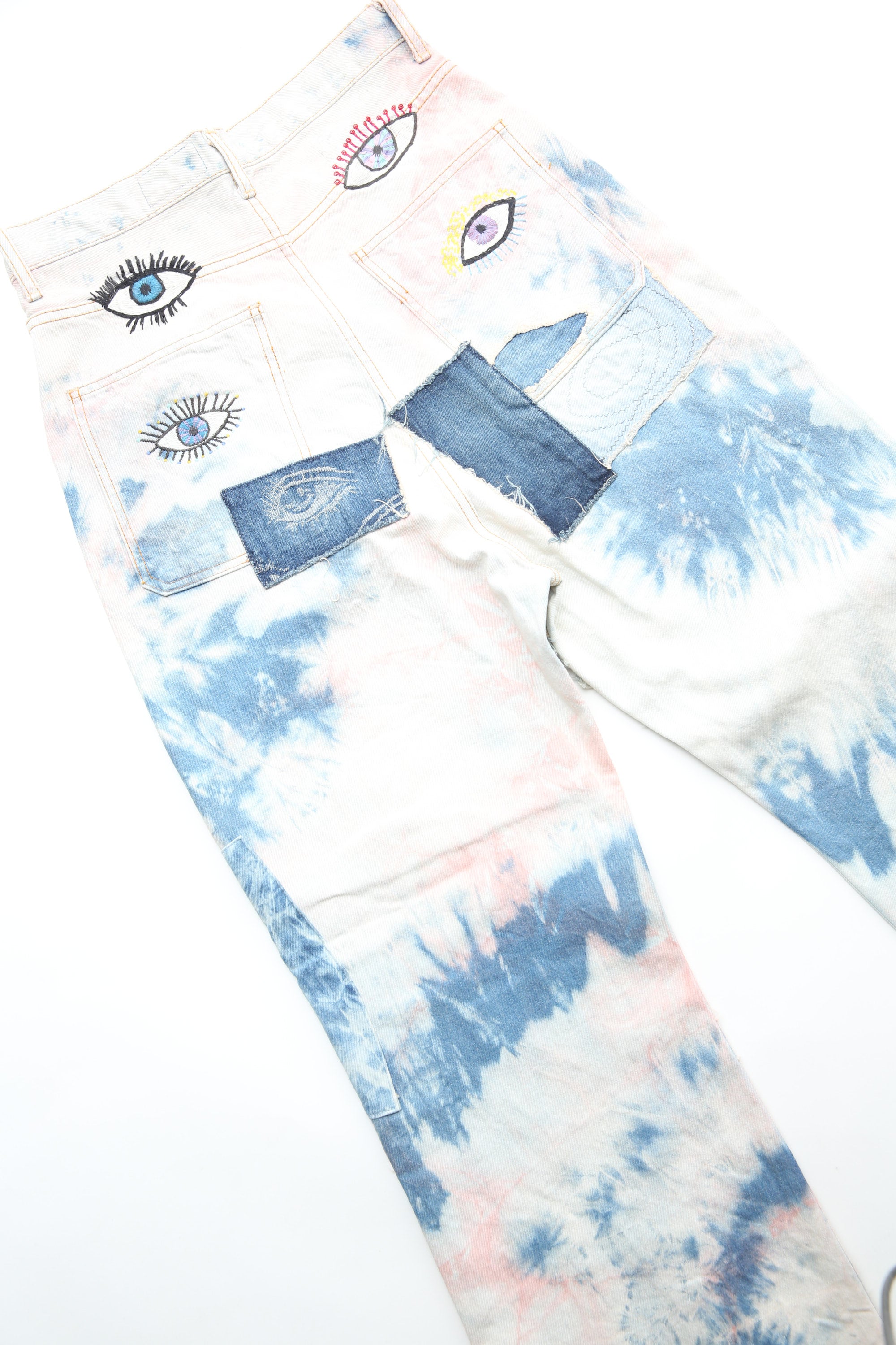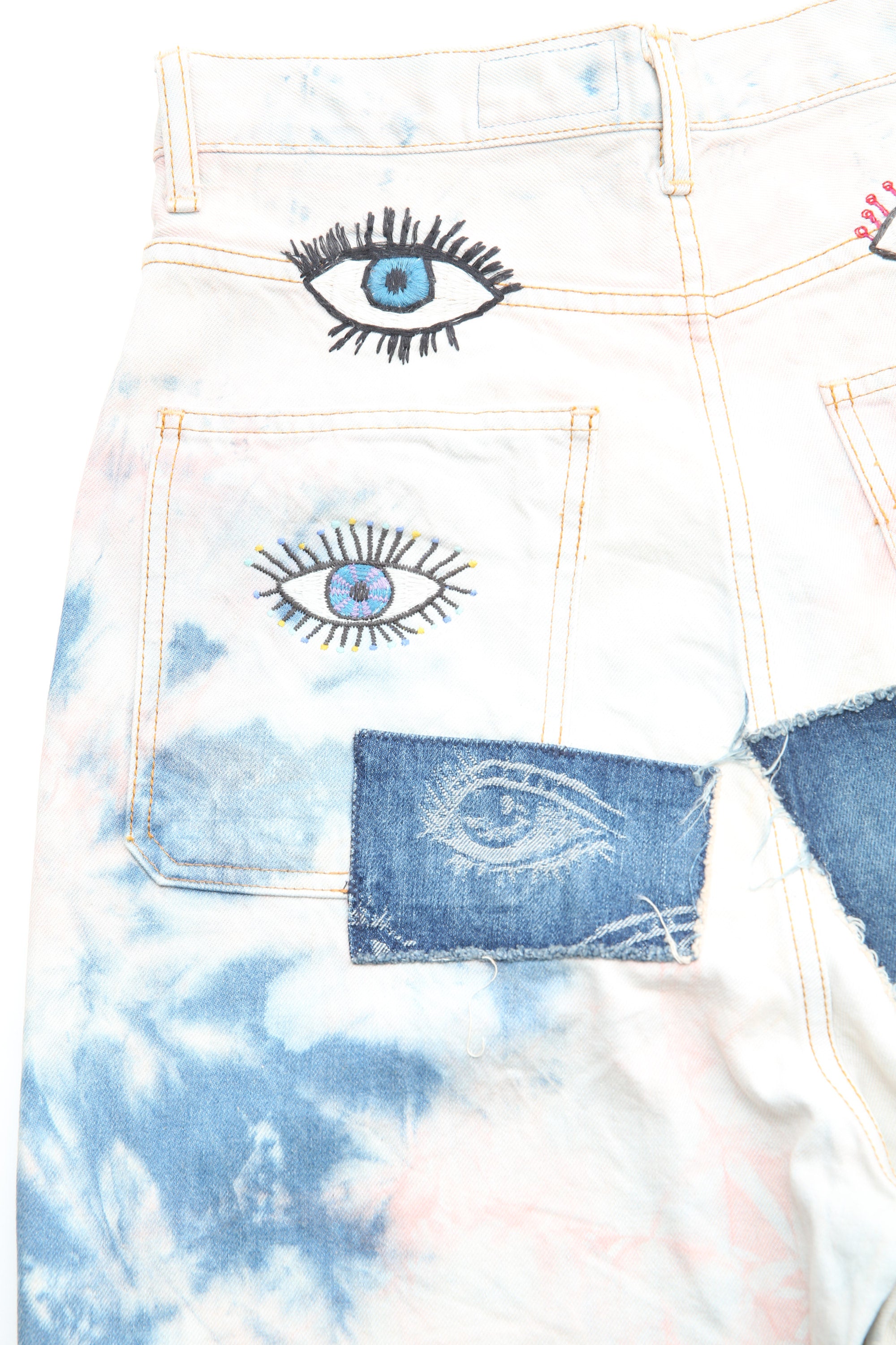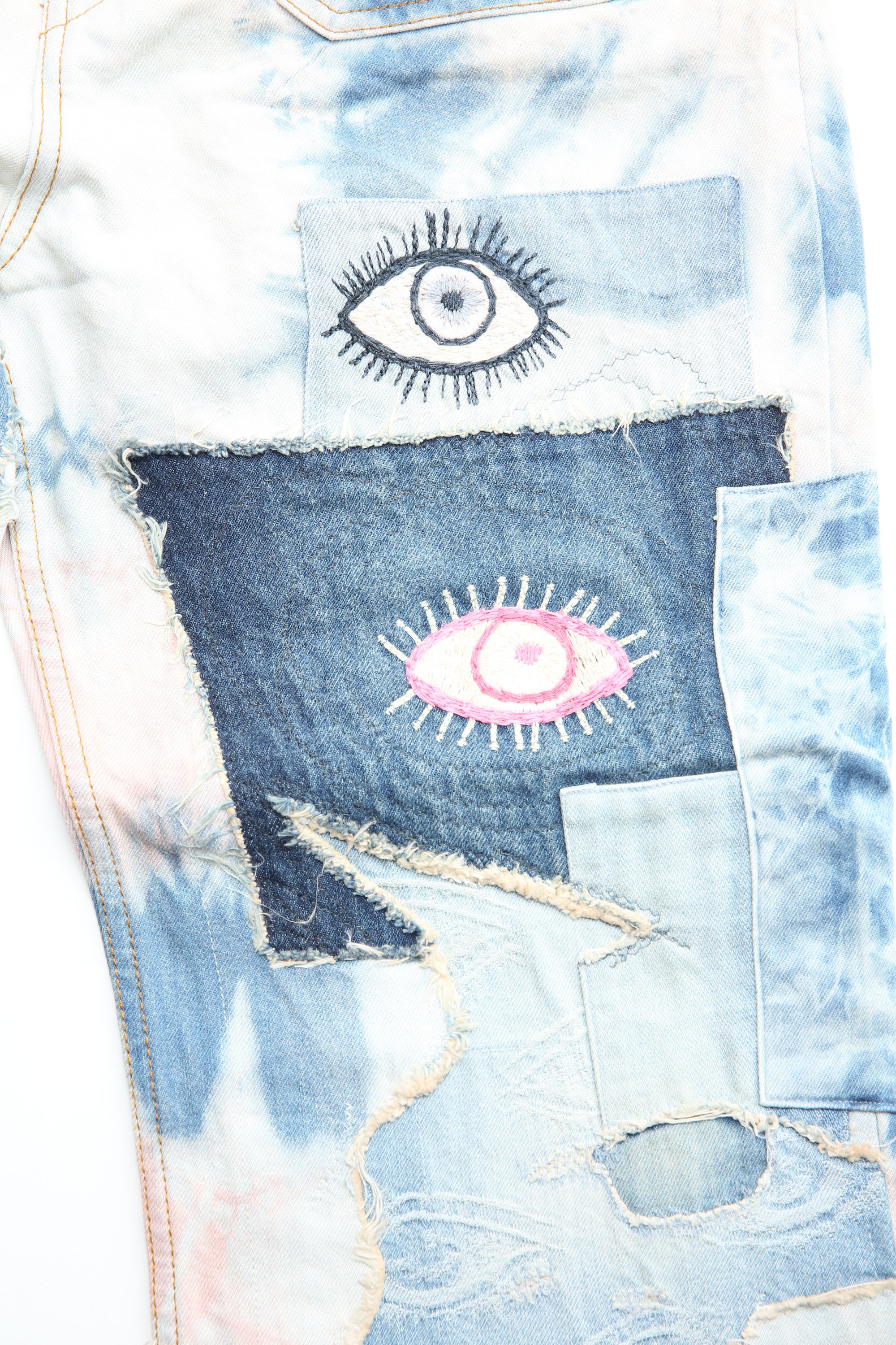 Get ready to turn heads with Kapital's 14oz Denim Tie-Dye Baggy Flare Pants! These eye-catching pants feature an all-over eyes patchwork design and distressed details. Perfect for the fashion-forward and quirky individual. (Pun intended!)