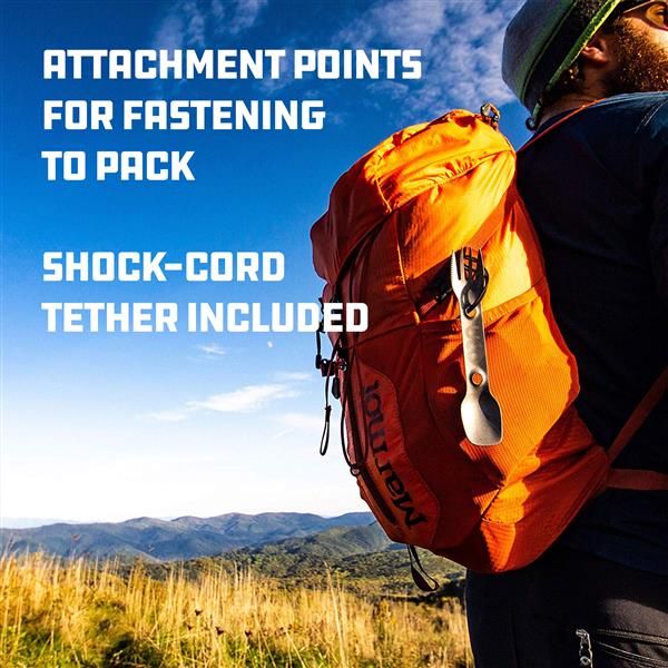 - Attachment points and reusable tether work together to attach the spork to a pack or hang it up to dry.