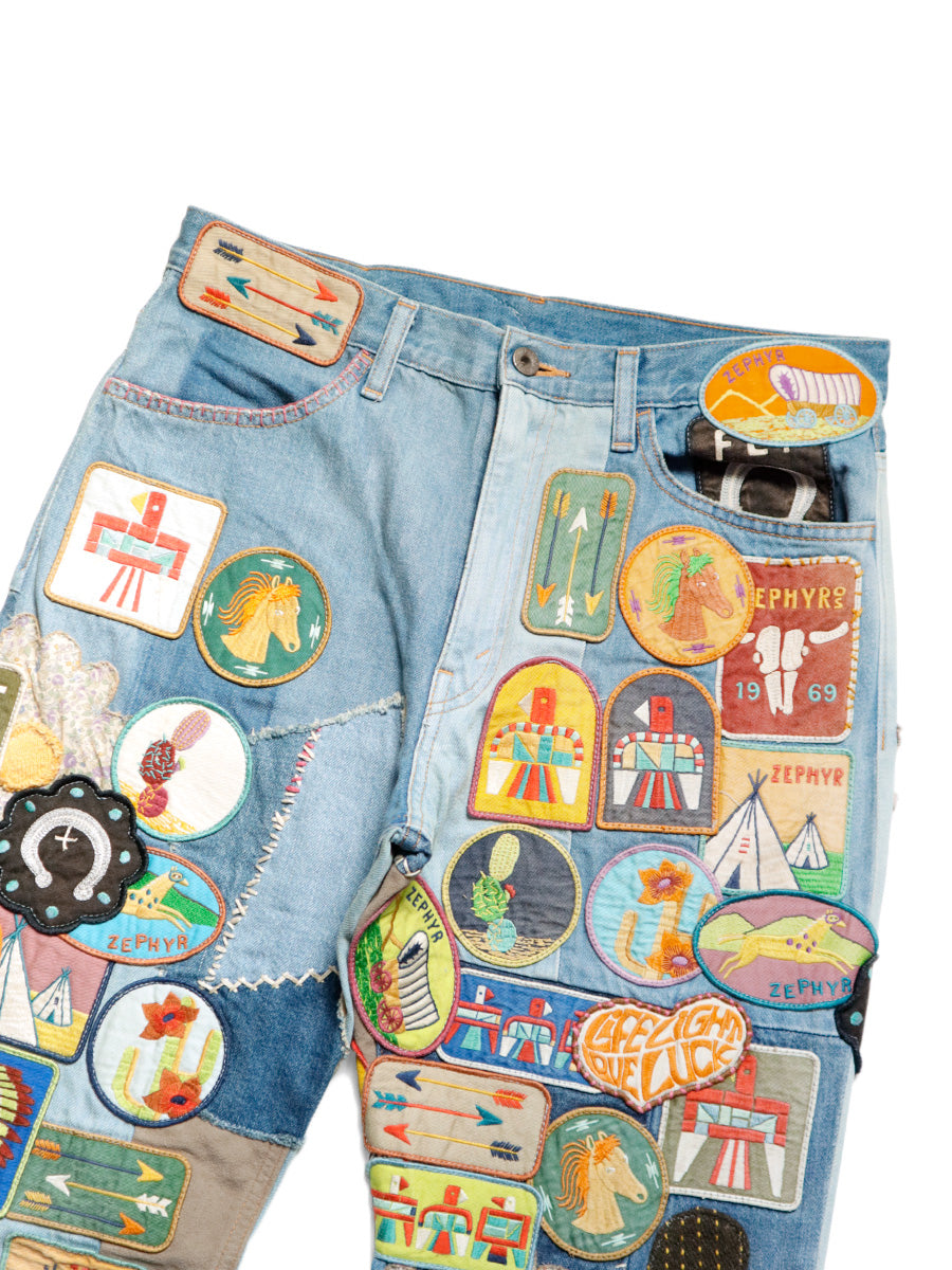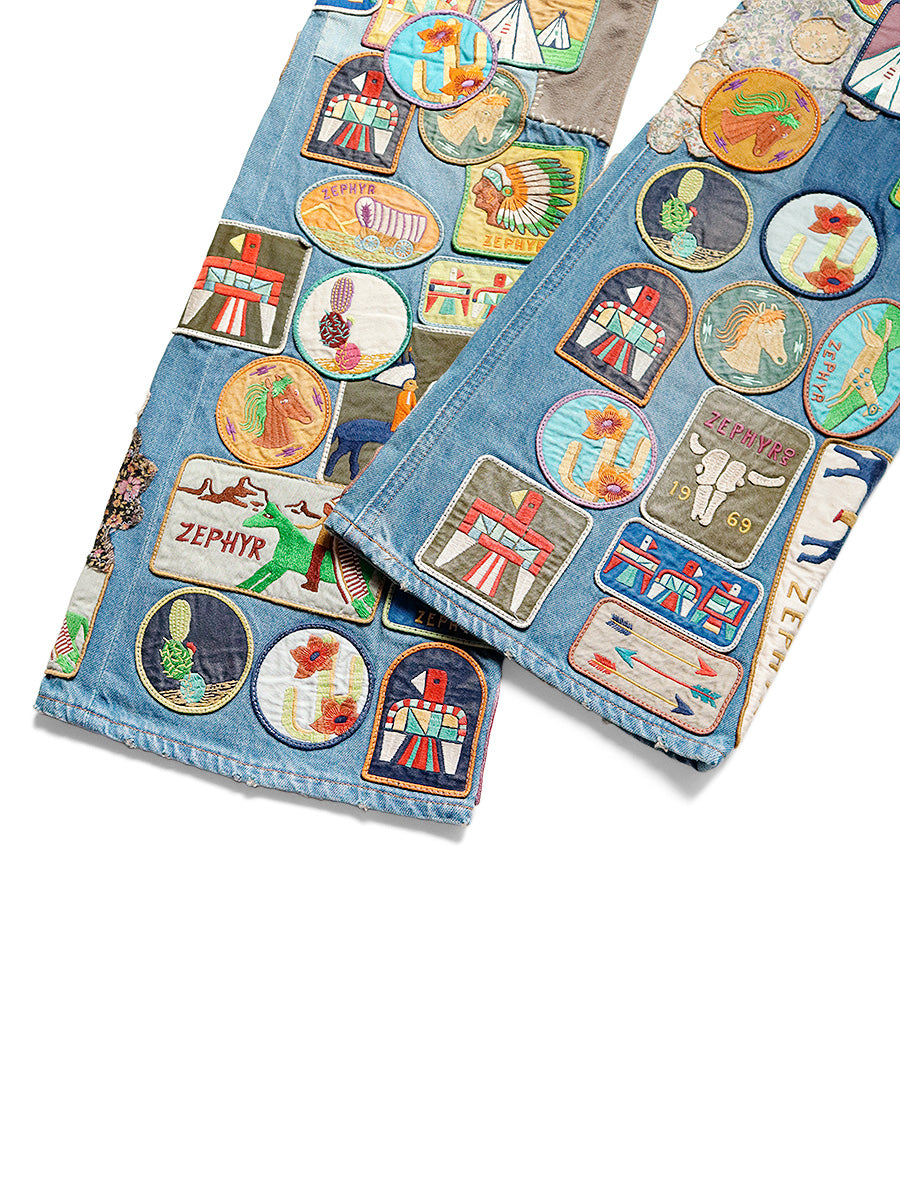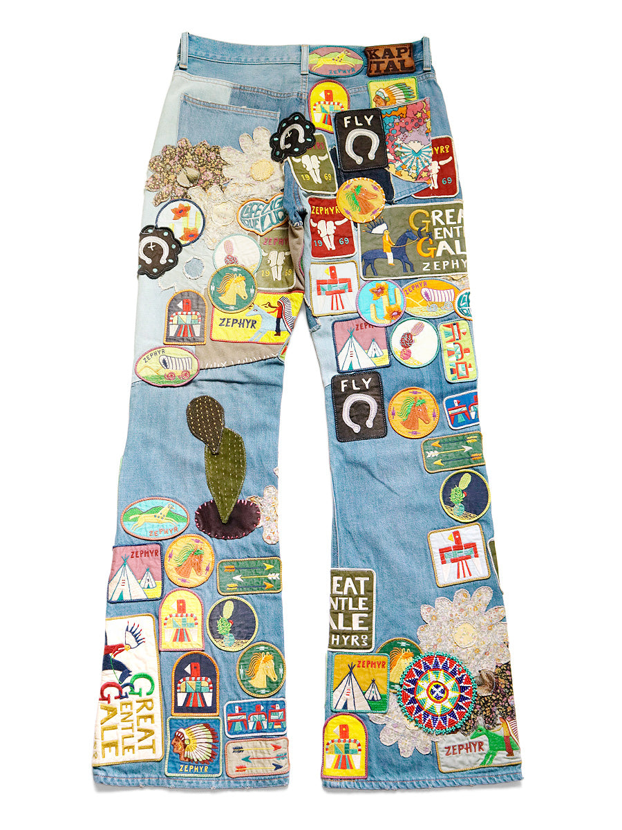 Rat flare pants with various designs of patches and embroidery related to "wind". It has a silhouette that gently widens towards the hem and is a zip open type.
