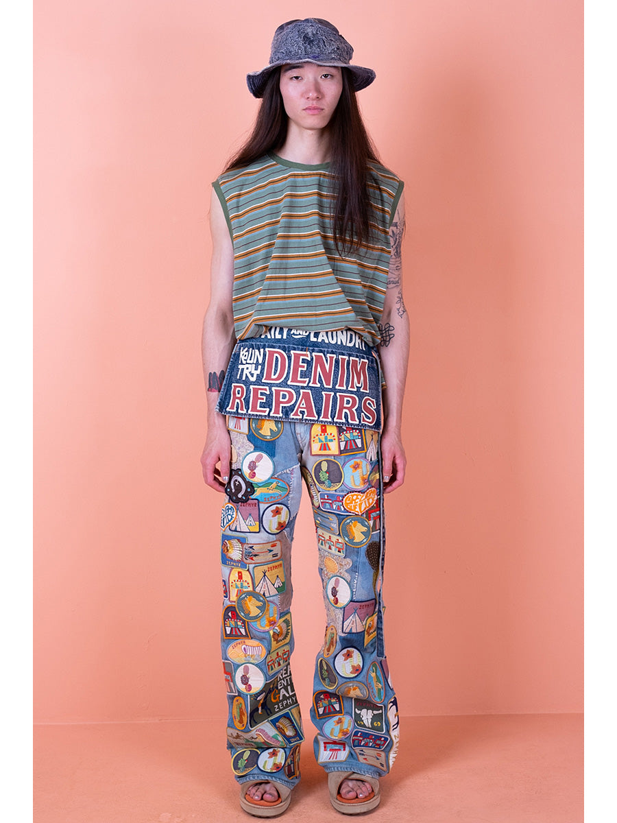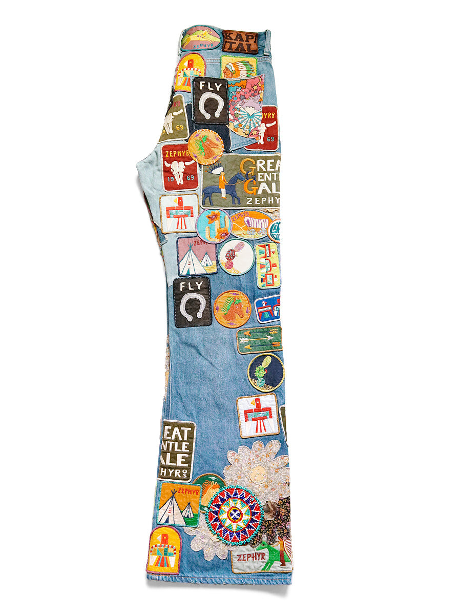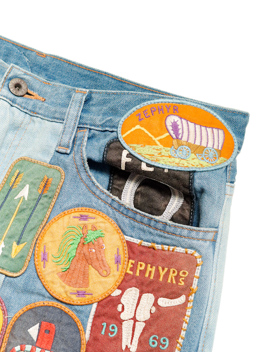 Rat flare pants with various designs of patches and embroidery related to "wind". It has a silhouette that gently widens towards the hem and is a zip open type.