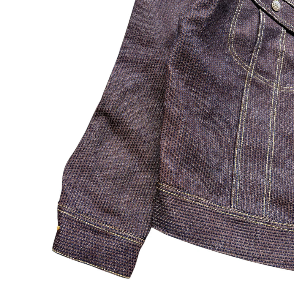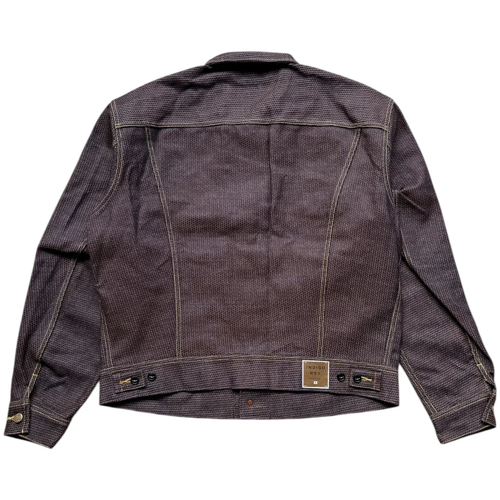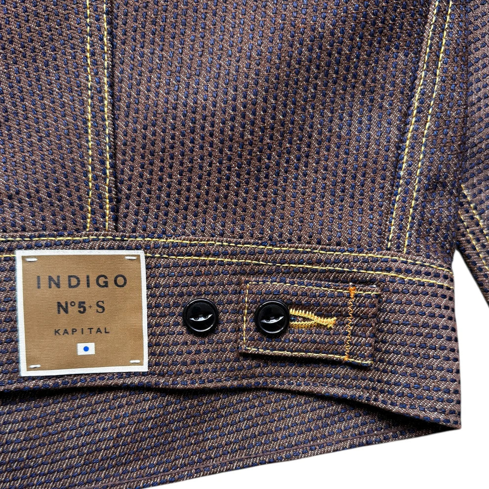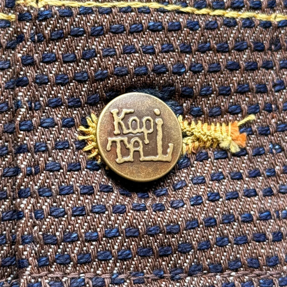 Crafted using Kakishibu dye, Kapital’s No. 5 Century Denim features a rich persimmon brown hue. Interwoven with a deep indigo sashiko fabric, the denim presents a striking contrast. True to its name, the Century Denim is exceptionally robust, designed for enduring wear over many years.