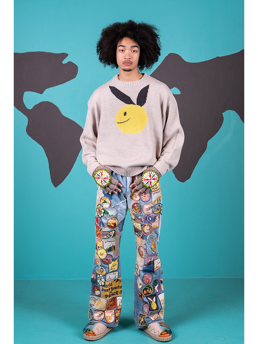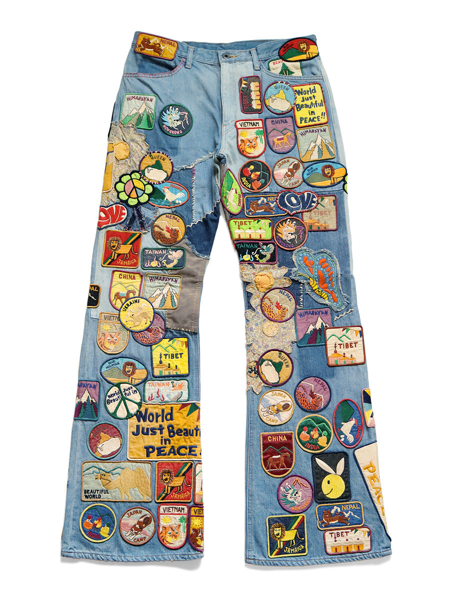 Rat flare pants featuring various emblems and embroidered designs. It has a zip open type with a silhouette that gently spreads toward the hem.