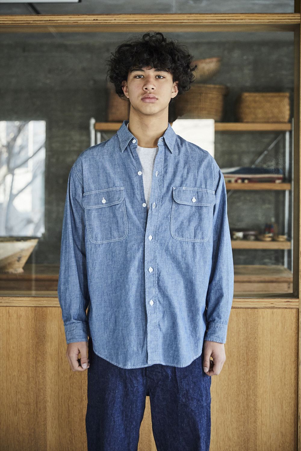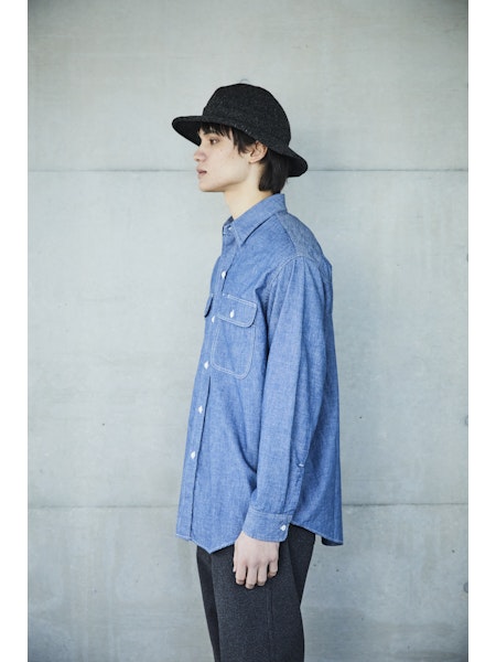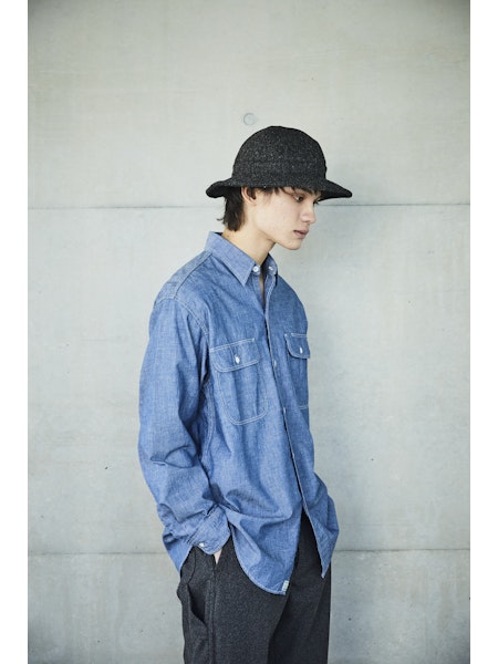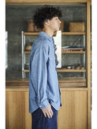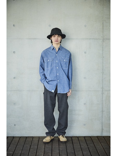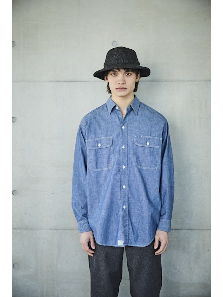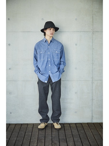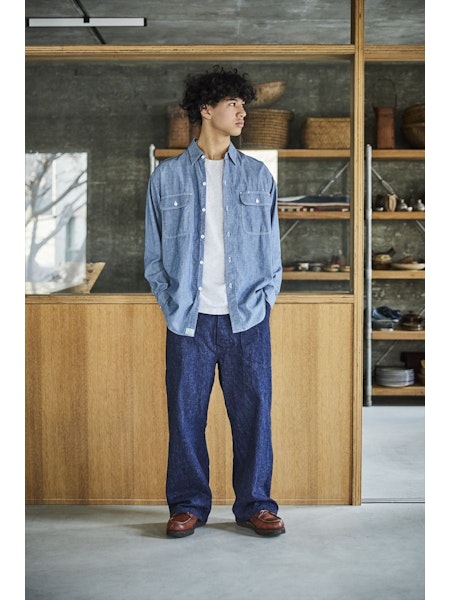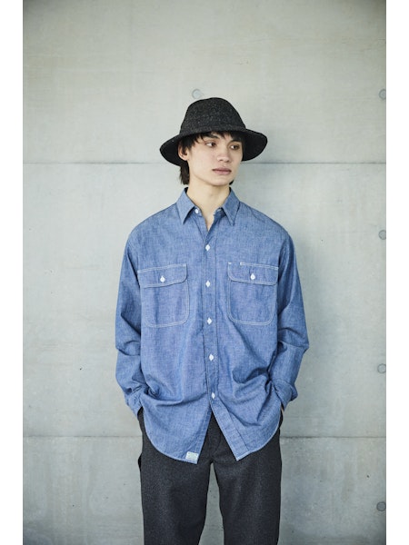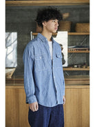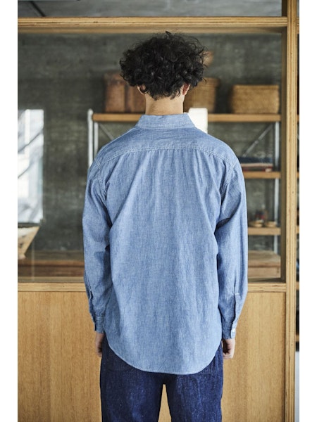 A simple chambray work shirt. The chambray fabric woven with vintage-like slub yarns evolves with repeated wearing and washing, developing a unique character over time. This classic silhouette of the work shirt remains timeless, unaffected by trends, making it a durable item that can be used for a long time.