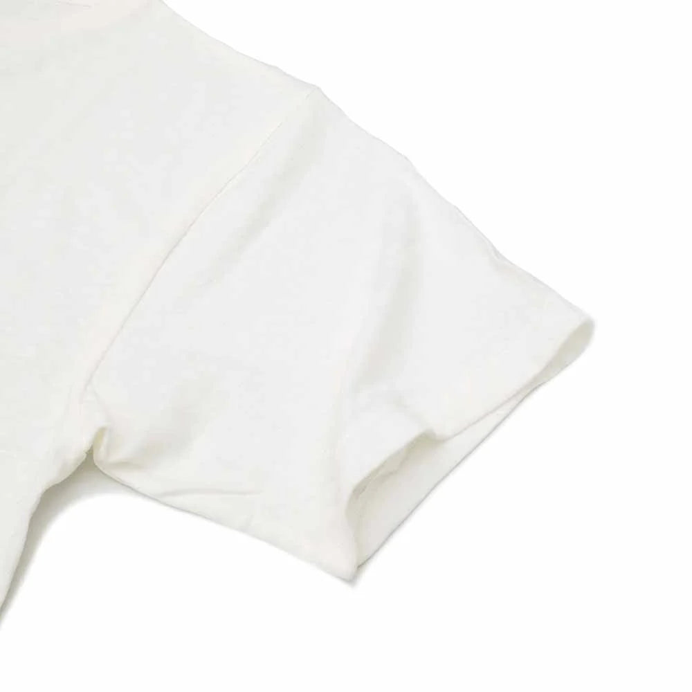 - This T-shirt is made of 5.4 oz jersey fabric knitted with a recycled-cotton blend. Recycled cotton yarn is made by collecting cotton scraps at the fabric cutting stage and cotton waste from spinning and sewing factories, and then reprocessing it into yarn. In addition to being environmentally friendly, recycled cotton has a unique soft texture and unevenness. This loop-wheeled T-shirt is made with vintage knitting machines and sewing machines.