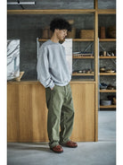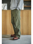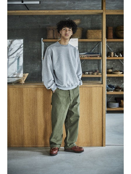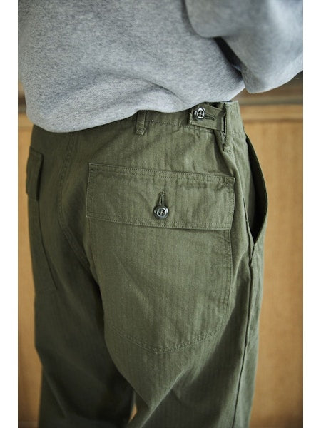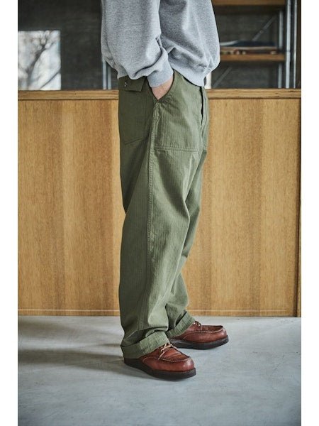 This fatigue pants, made from herringbone twill, are a reproduction of the 1940s fatigue pants, which predate the era when reverse satin was used. Like the original vintage pieces, they feature a deep rise and a wide silhouette. The stitching details and accessories have been faithfully recreated to match the vintage design.
