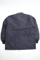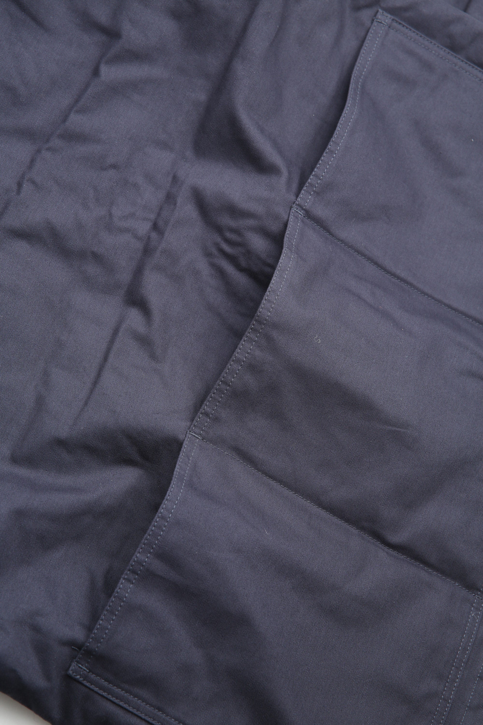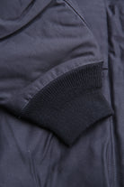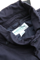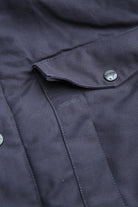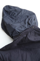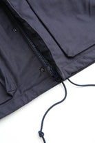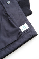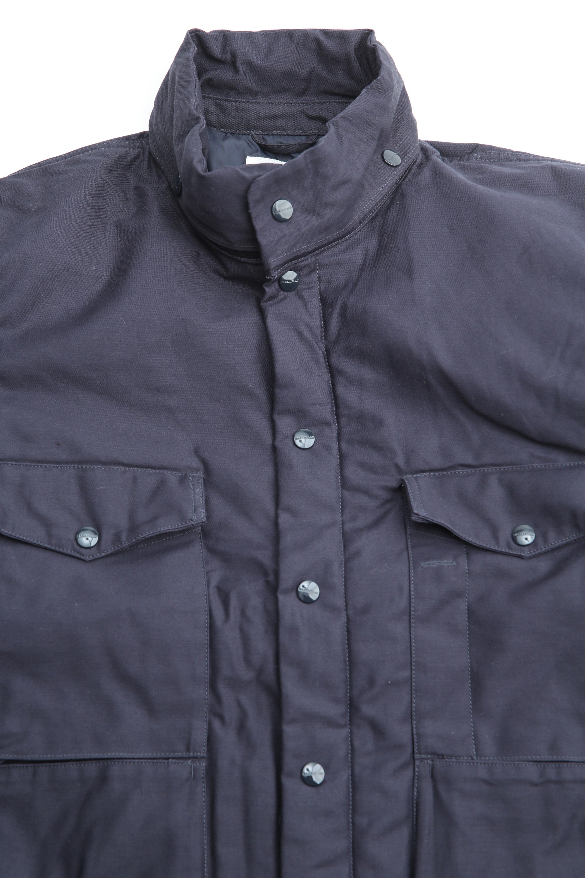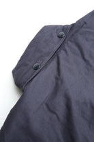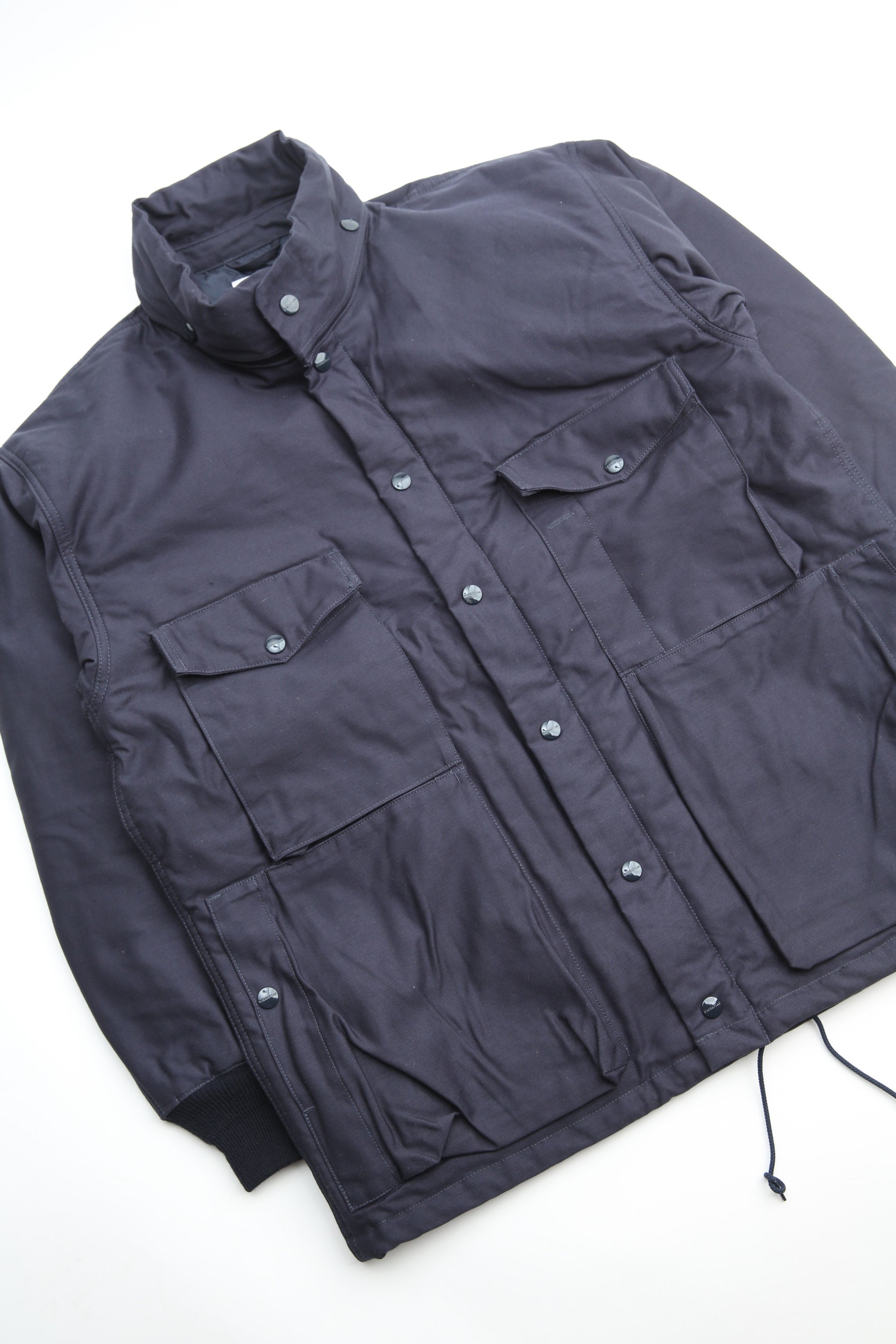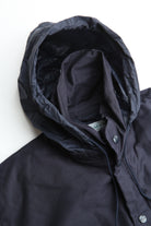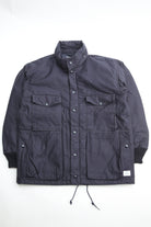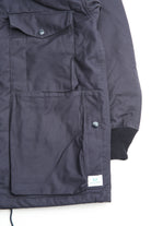 A new insulated jacket made from back satin fabric, it's based on the classic M-65. The collar is a stand-up collar with a hidden hood stow. There are pockets on the left and right front that have two compartments which can be accessed from the top or the side. There is also a large pocket with three compartments on the back. The cuffs are ribbed and filled with padding for warmth. The jacket fits wide to allow for additional layers to be worn underneath.