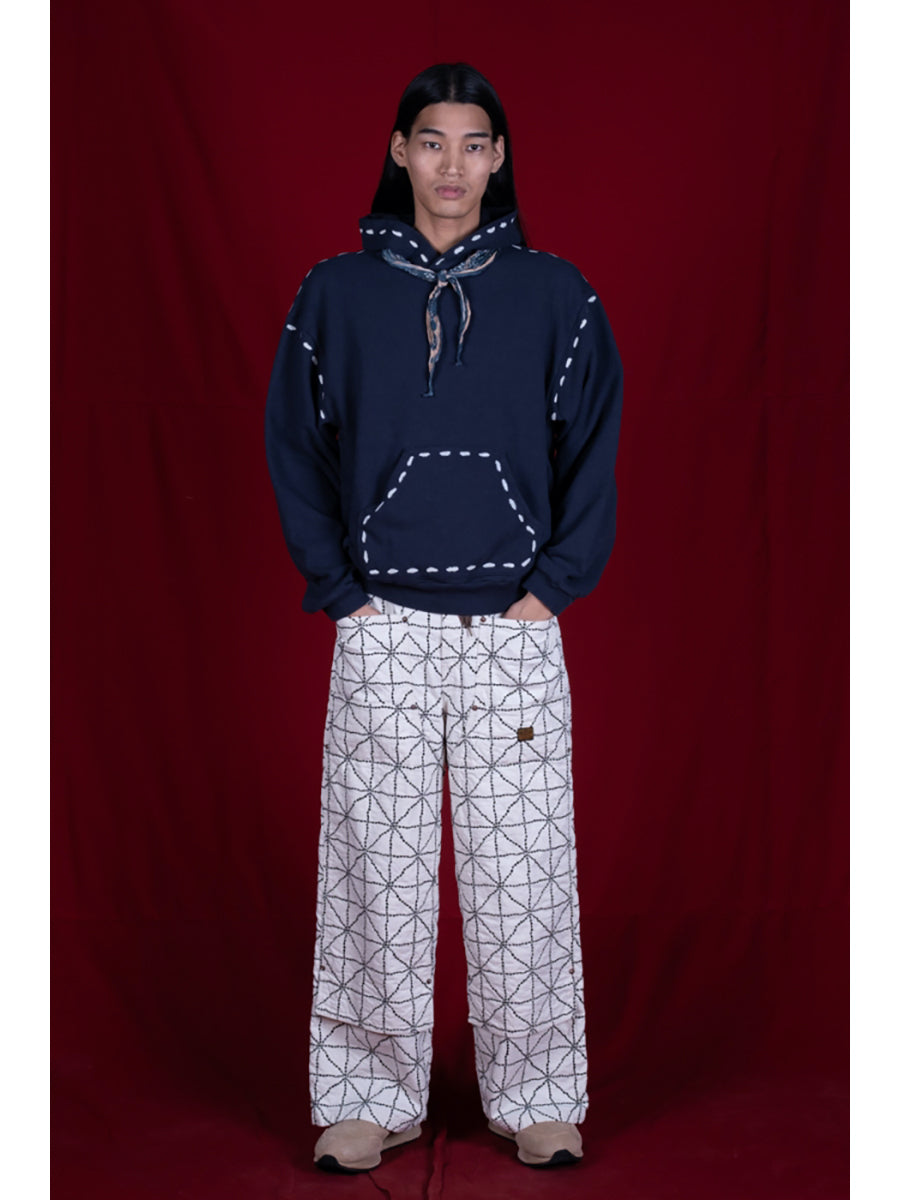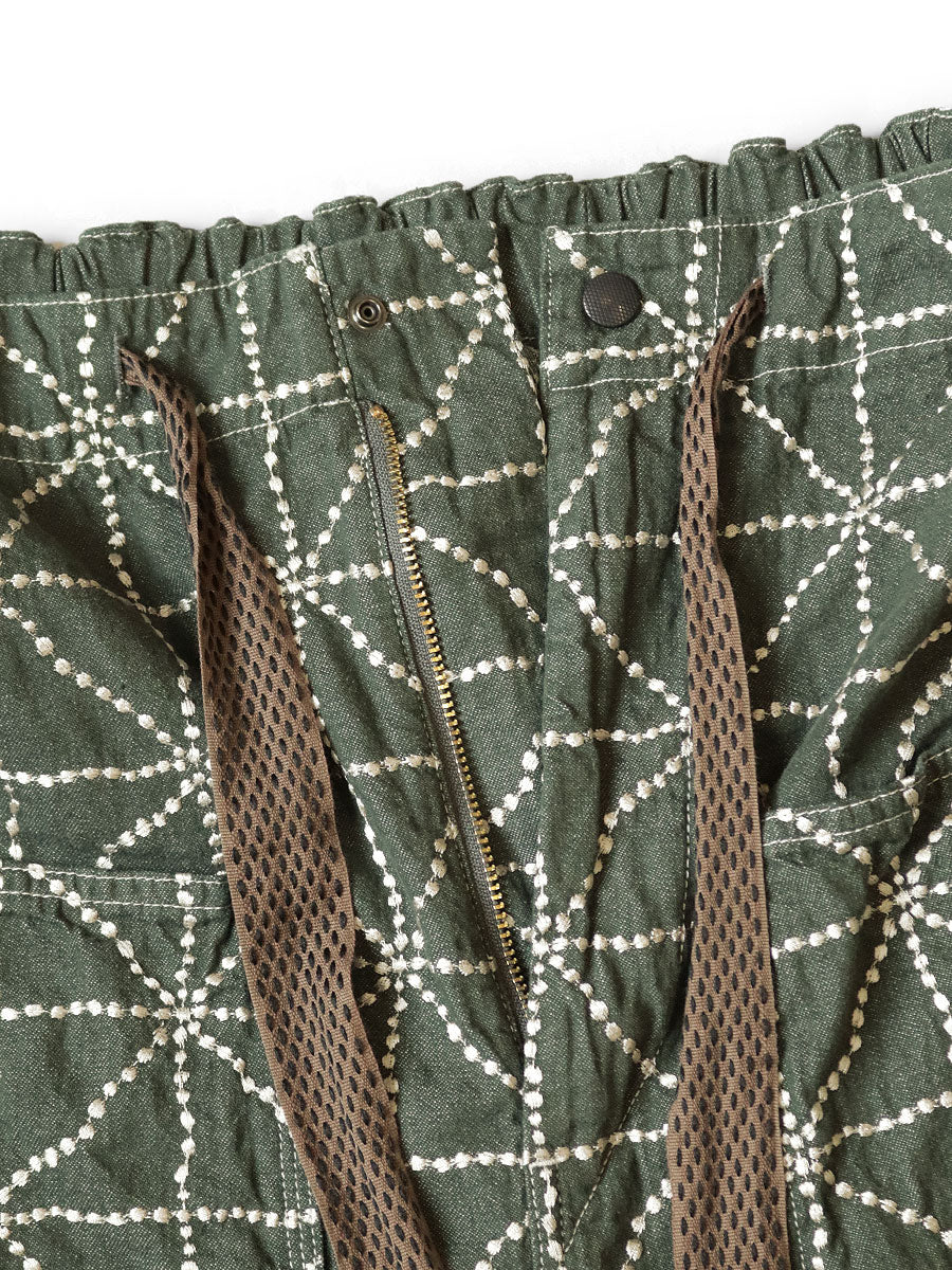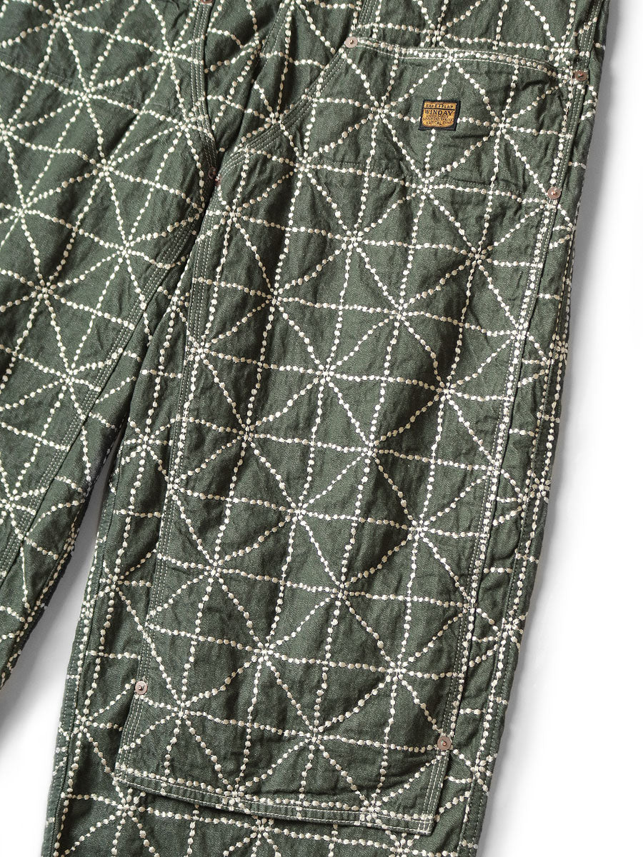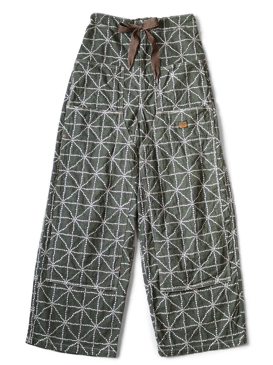 Baggy pants with sashiko design seen on judo uniforms. Made from 8oz colored denim, the waist is elastic and has a drawstring for easy wear. Double knee work design.