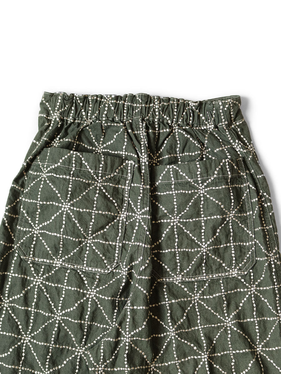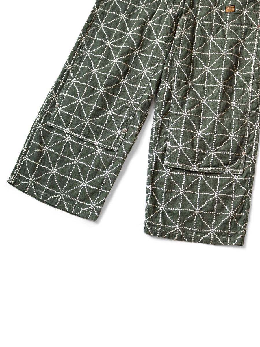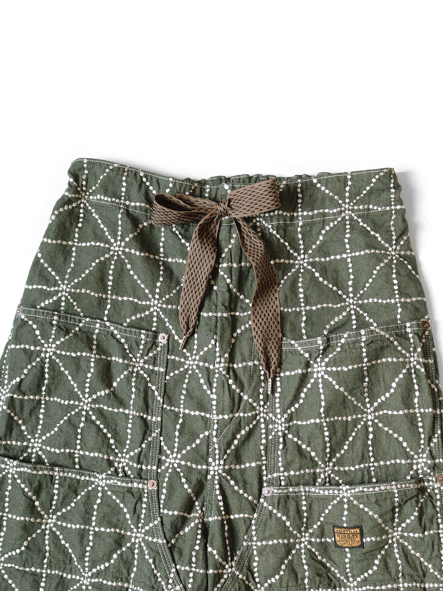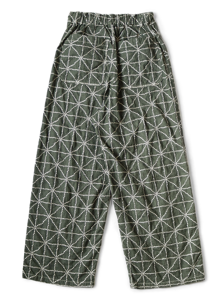Baggy pants with sashiko design seen on judo uniforms. Made from 8oz colored denim, the waist is elastic and has a drawstring for easy wear. Double knee work design.