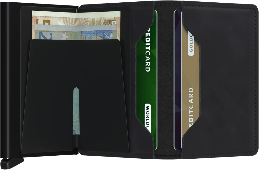 - Its slim profile makes the Slimwallet fit perfectly into every pocket. The open exterior is cut extra wide to hold cards, banknotes and receipts. The Cardprotector mechanism allows you to slide out cards with one simple motion, while the aluminium protects your cards from bending, breaking and unwanted wireless communication.