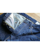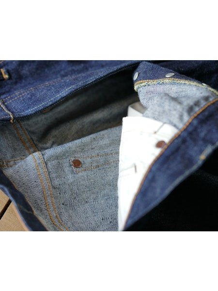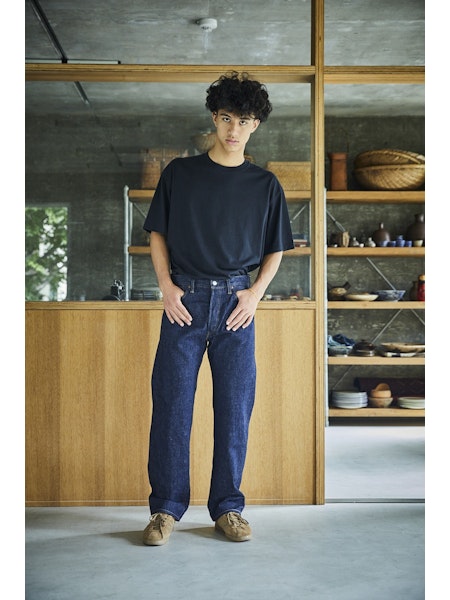 A model designed based on an analysis of jeans from the early 1950s. The denim, woven on vintage shuttle looms using yarn spun on a 1953 machine, develops a natural, uneven fade similar to that of 1950s jeans. For stitching, cotton thread is used, which blends well with the cotton fabric and undergoes aging over time, just like the material. Produced using manufacturing methods faithful to the 1950s, the side seams twist toward the right with wear. This is not a defect but a deliberate reproduction of the characteristics of jeans from that era. The silhouette will be slightly wider compared to our classic 105 STANDARD SELVEDGE DENIM.