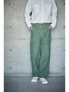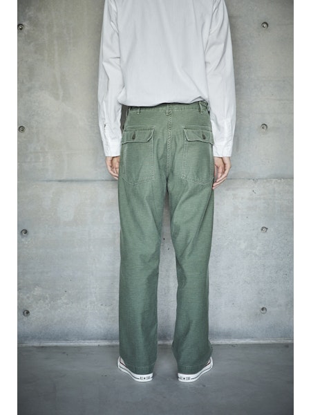 Taking inspiration from the U.S. Army's utility trousers, we crafted a silhouette that is comfortable for everyday wear and easy to pair. The original reverse satin is carefully selected from the spinning stage and dyed using a special dyeing method. Through repeated washing and wearing, it will develop an aging effect similar to vintage clothing. This is the used-wash version and the fabric has softened, resulting in a soft texture.