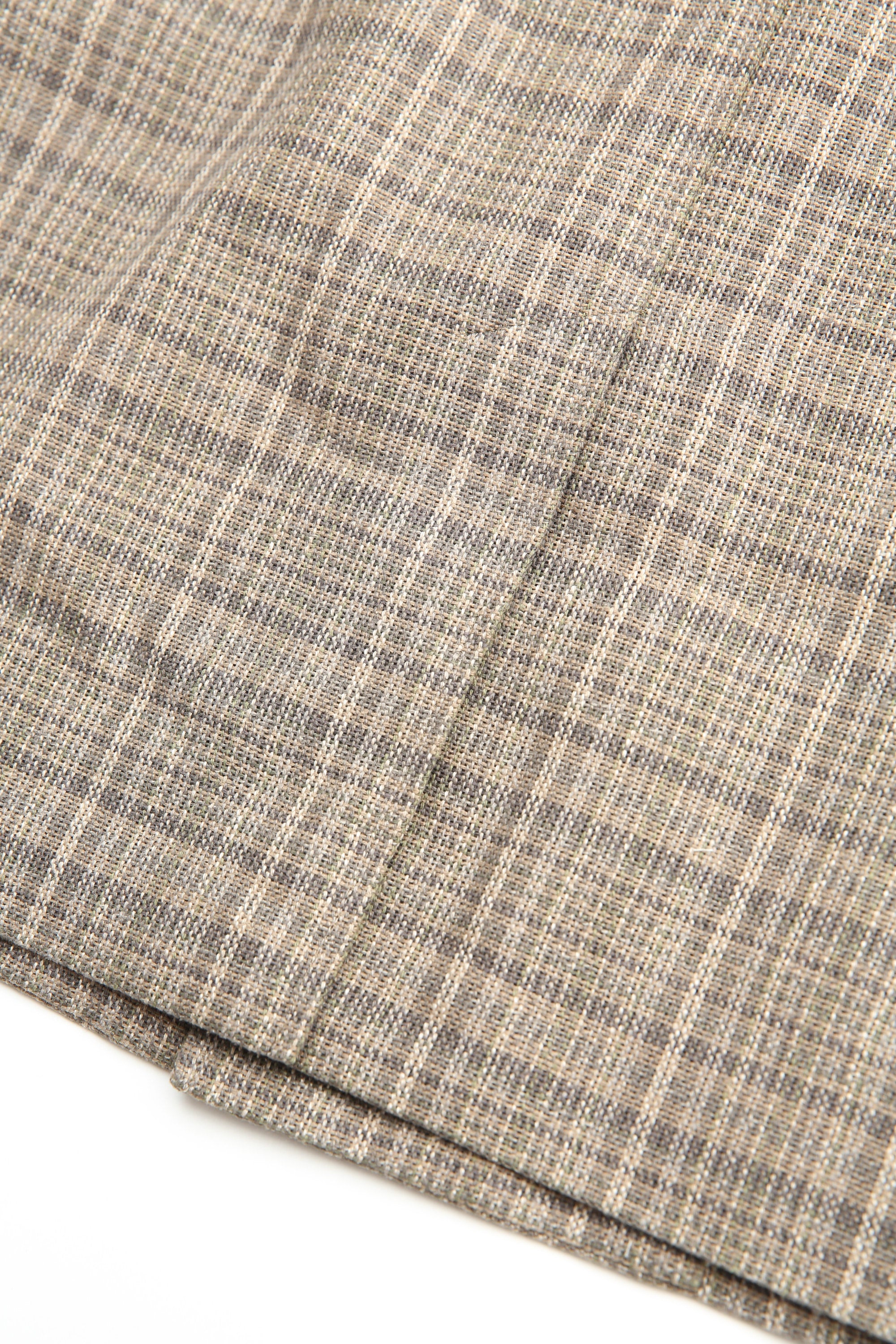 A summer tweed featuring a check pattern woven with tri-blend melange yarns of silk and linen in both the warp and weft.