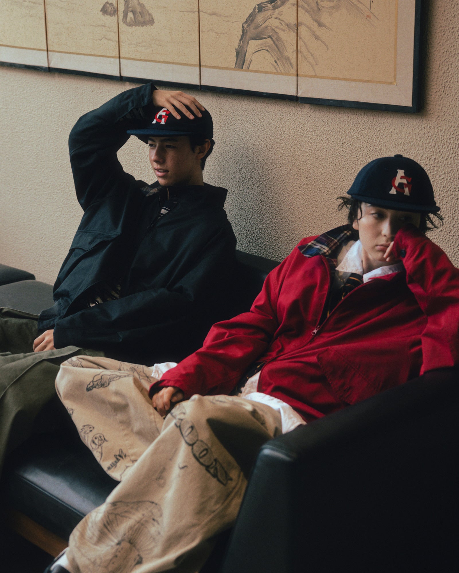 These balloon chino pants feature hand-drawn graphics. The relaxed silhouette creates a casual yet trendy look.