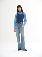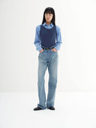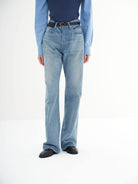 Denim meticulously woven on a shuttle loom using short-staple fibers dyed with rope dyeing on the warp and high-quality Supima cotton on the weft. By intentionally using short fibers on the warp, it achieves a rugged and softly vintage texture, while the use of long fibers on the weft creates an elegant fullness and soft feel.