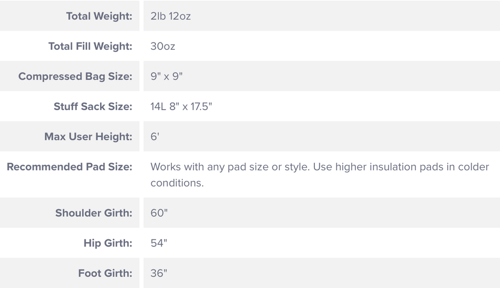 - Traditional mummy shape allows for light weight and increased body heat retention
