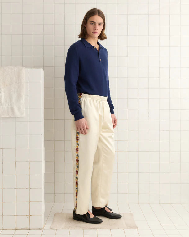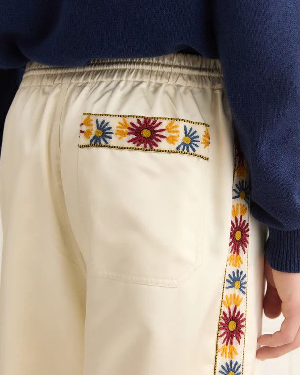 These track pants are inspired by an organza collar from the 1960s, which featured colorful yarn embroidery. We reproduced the embroidered floral trim for this style, applied down the side seams and back pocket.