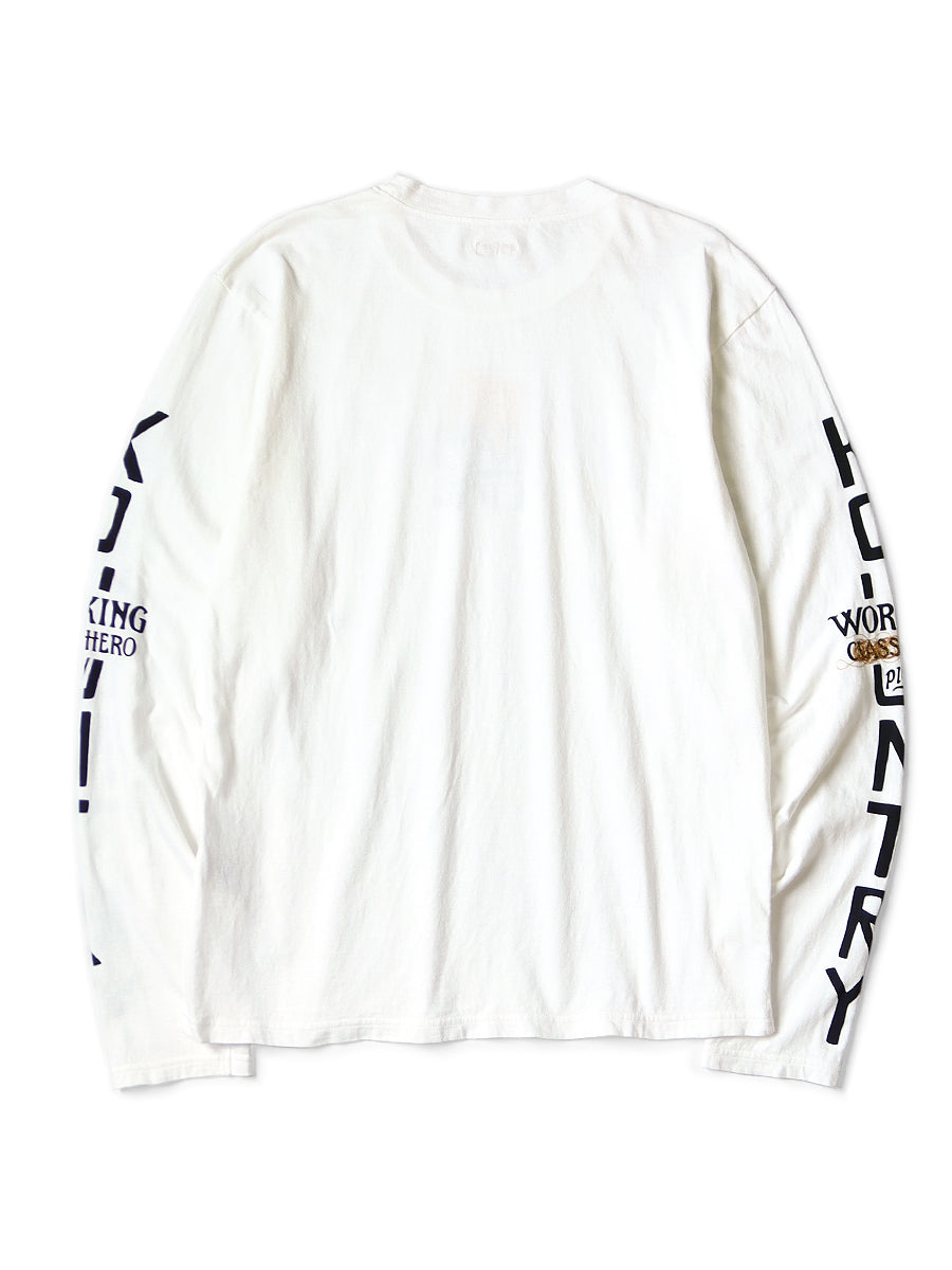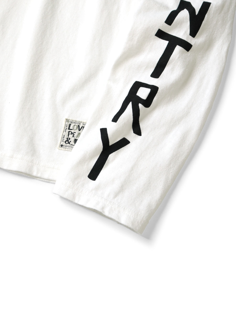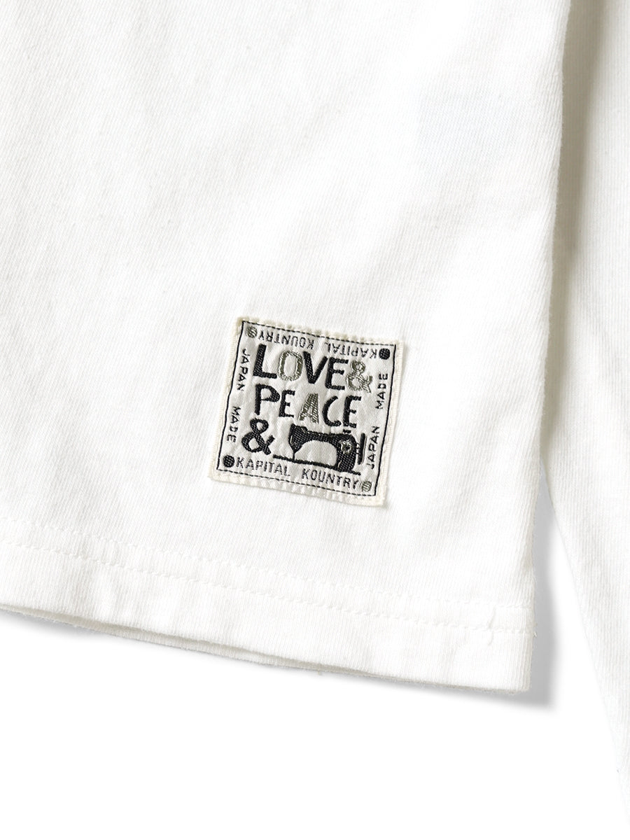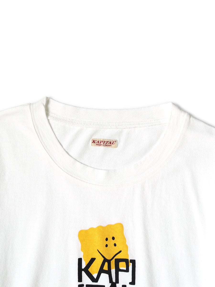 A crew neck long sleeve T-shirt made of smooth jersey fabric. The front features a RAINBOWY cookie print and the "KAP][TAL" logo used on the leather label of KAPITAL jeans. The KOUNTRY logo is printed on both sleeves.