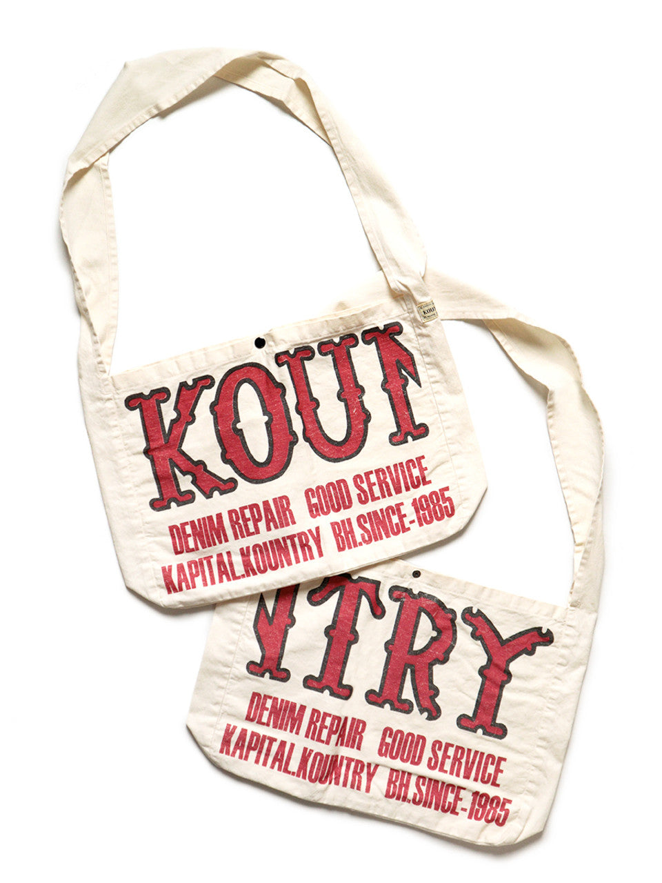 A cotton twill tote bag with a roomy gusset. Features the throwback KOUNTRY label design. *Please note: The print on this item is not permanent and may peel off from normal use or washing. Made of 100% cotton.