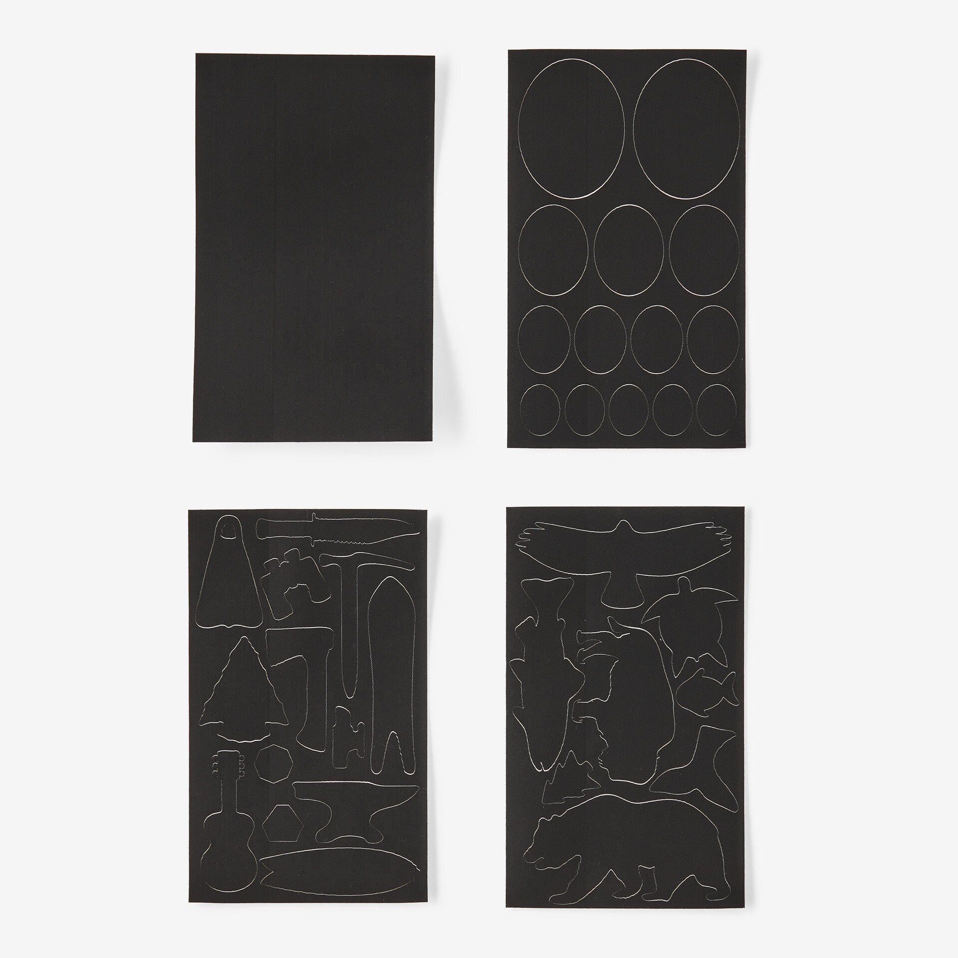 Kit includes four 3" x 5" pages of black Tenacious Tape® with varying sizes and shapes of patches for fixing gear